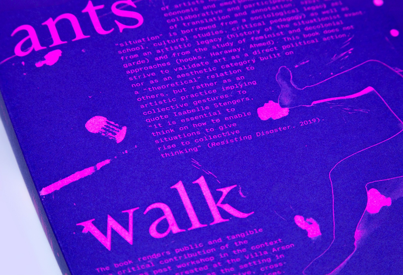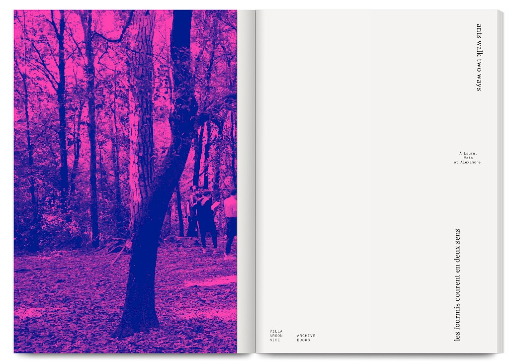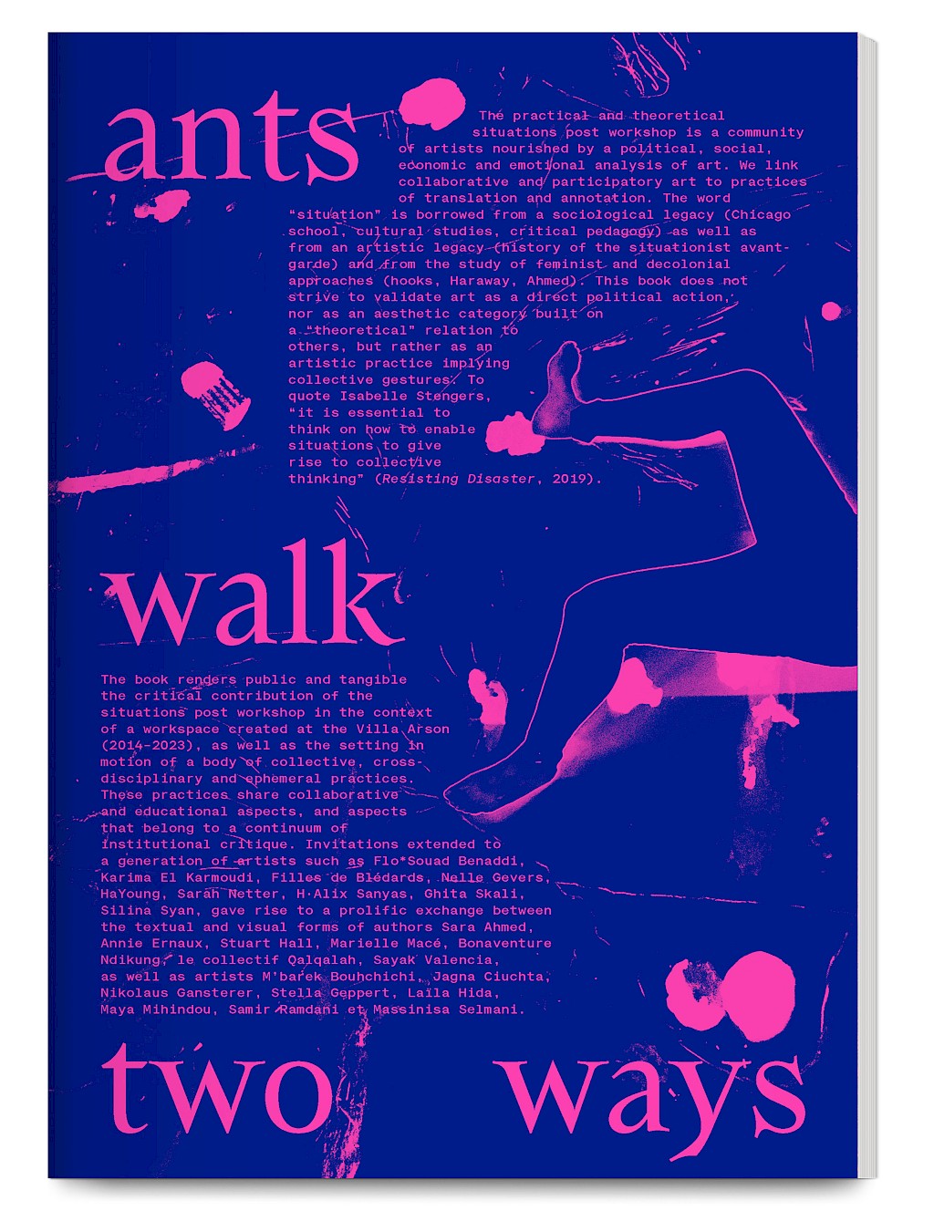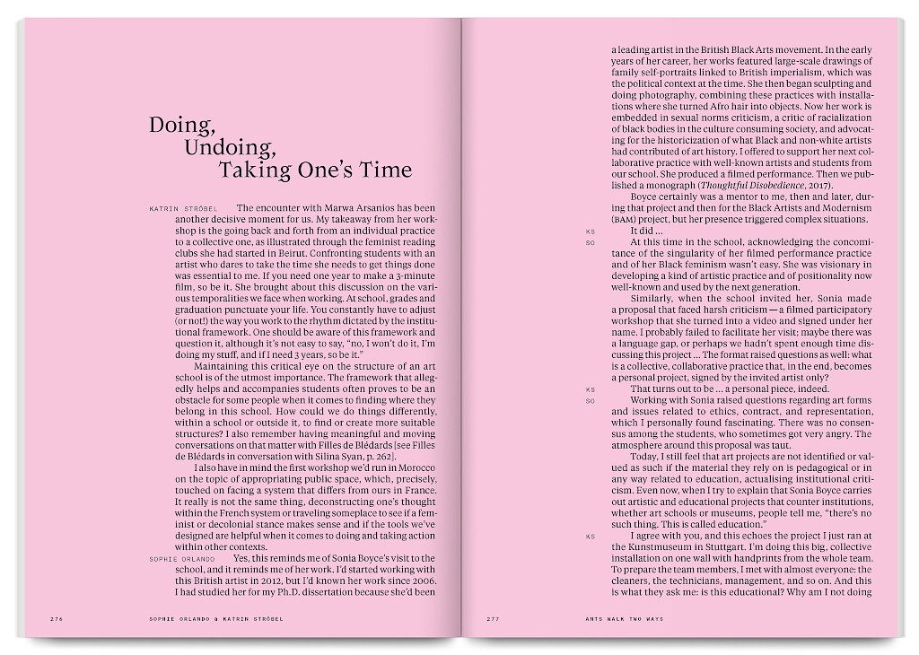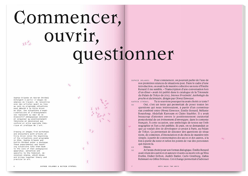 Ants Walk Two Ways is a collective publication based on Situation Post, a research project run by Katrin Stroebel and Sophie Orlando for almost 10 years at the Villa Arson, Nice. This pedagogical project navigates collective practices, contextual thinking, feminist, queer and postcolonial approaches in art and design. The publication follows this non-linear approach and wanders between interviews, contributions, essays and visual essays. The publication is printed in CMYK with neon magenta. Fluorescent ants travel up and down the publication, they can be seen as a metaphor for supporting the collective, for teaching, studying and working together.