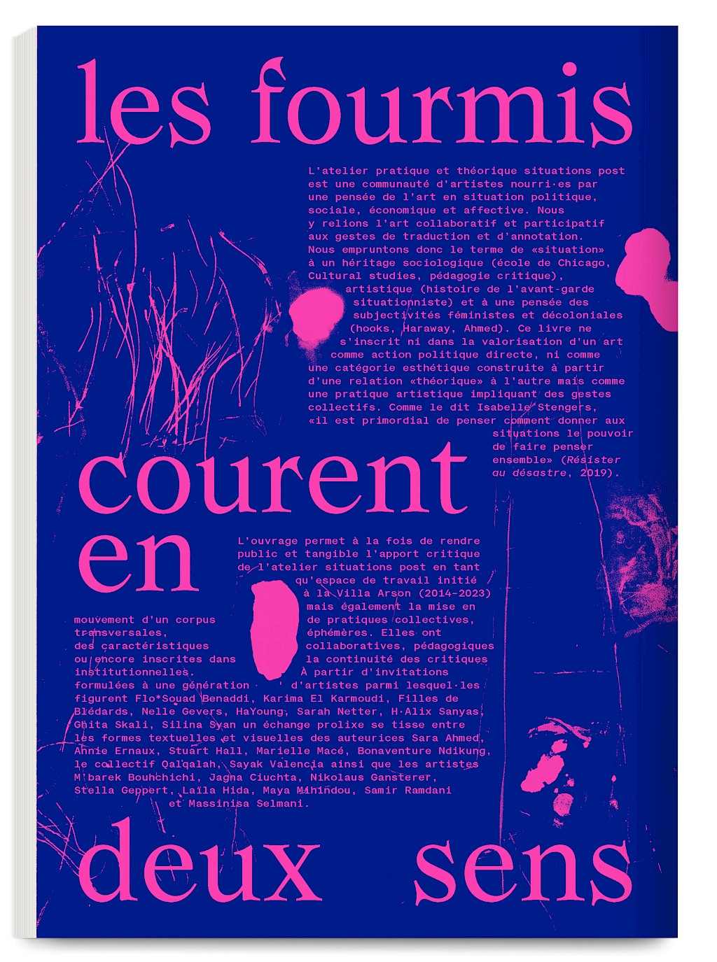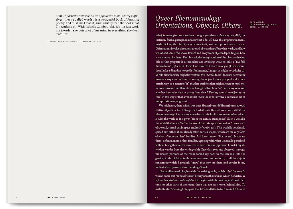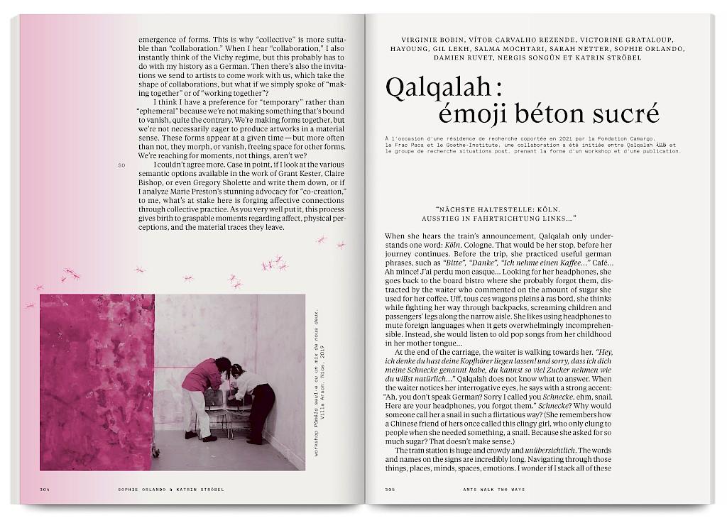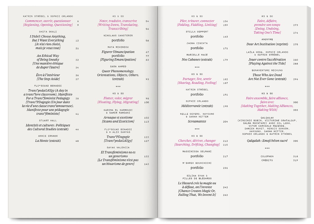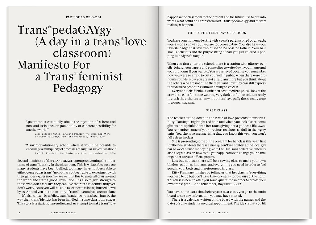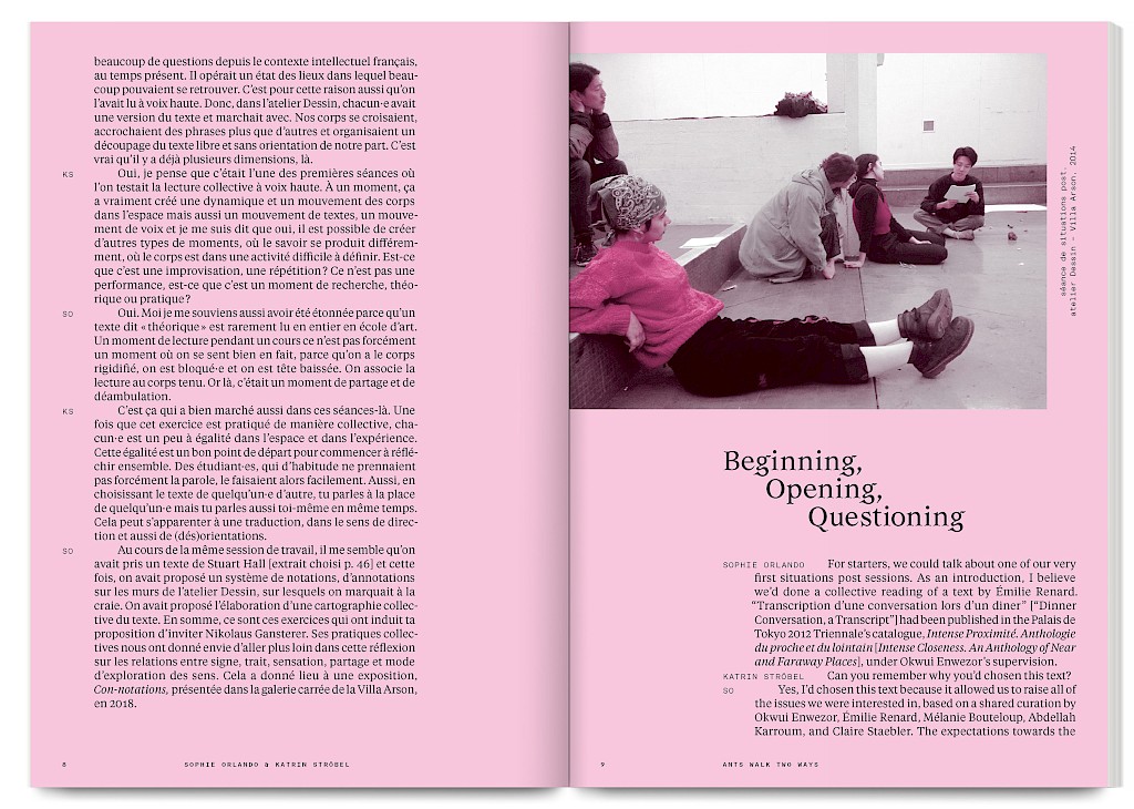 Ants Walk Two Ways is a collective publication based on Situation Post, a research project run by Katrin Stroebel and Sophie Orlando for almost 10 years at the Villa Arson, Nice. This pedagogical project navigates collective practices, contextual thinking, feminist, queer and postcolonial approaches in art and design. The publication follows this non-linear approach and wanders between interviews, contributions, essays and visual essays. The publication is printed in CMYK with neon magenta. Fluorescent ants travel up and down the publication, they can be seen as a metaphor for supporting the collective, for teaching, studying and working together.