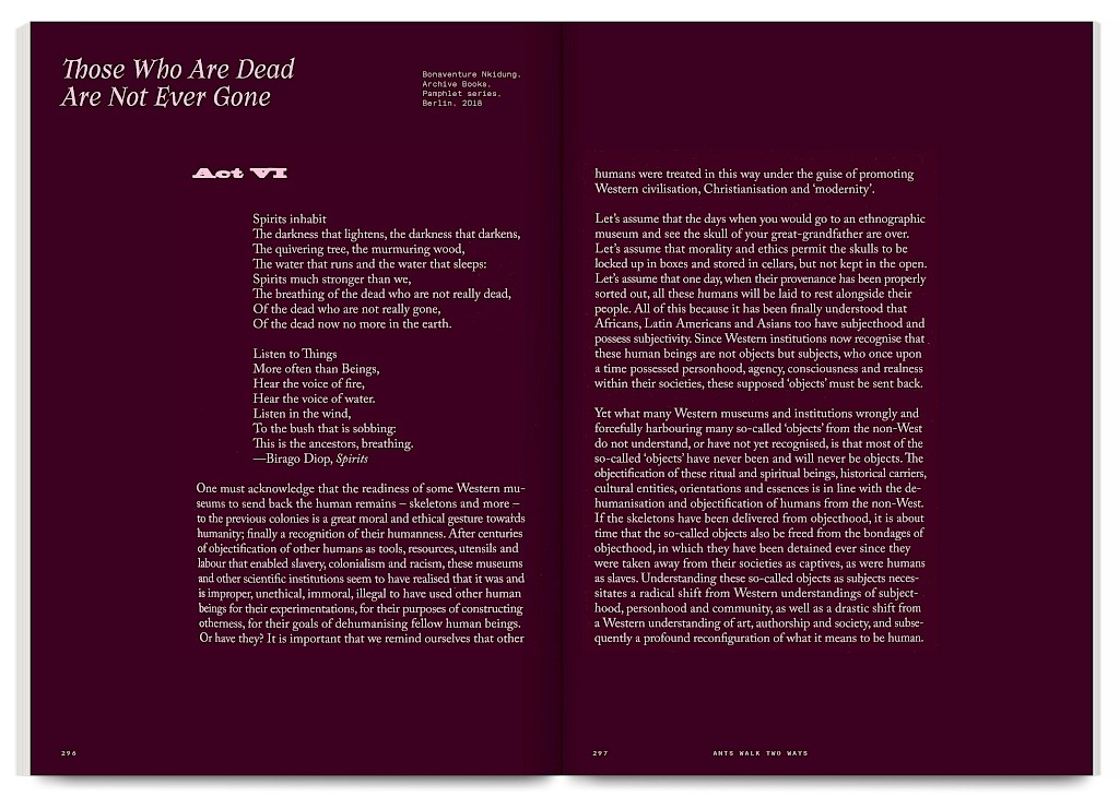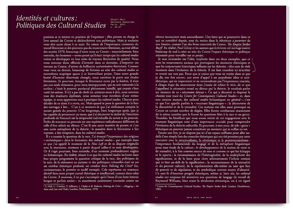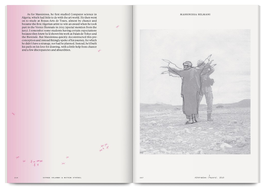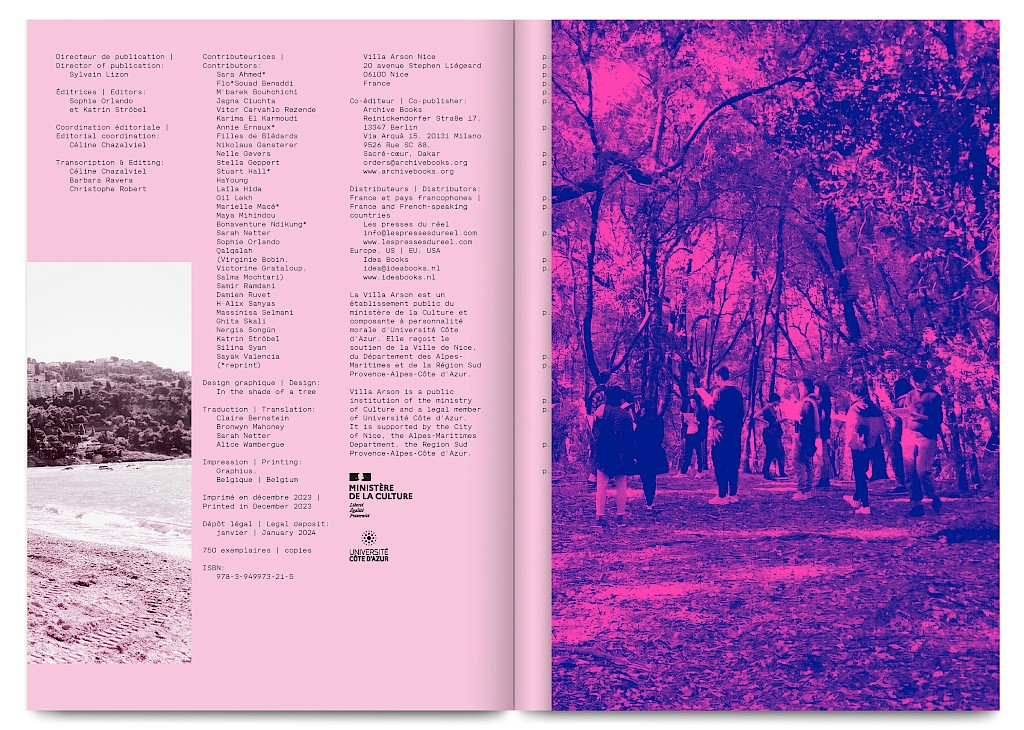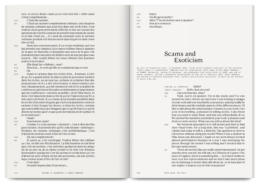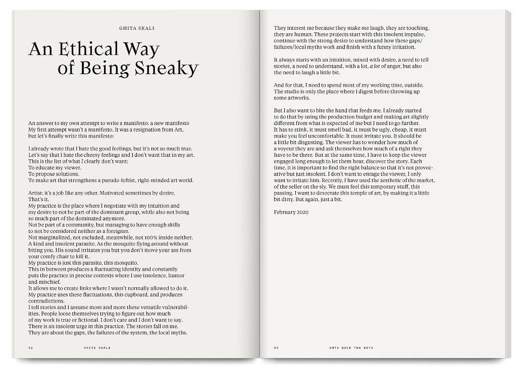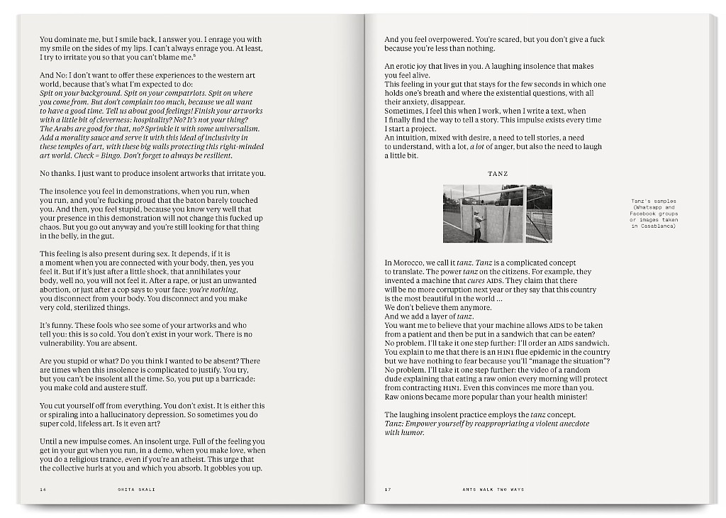 Ants Walk Two Ways is a collective publication based on Situation Post, a research project run by Katrin Stroebel and Sophie Orlando for almost 10 years at the Villa Arson, Nice. This pedagogical project navigates collective practices, contextual thinking, feminist, queer and postcolonial approaches in art and design. The publication follows this non-linear approach and wanders between interviews, contributions, essays and visual essays. The publication is printed in CMYK with neon magenta. Fluorescent ants travel up and down the publication, they can be seen as a metaphor for supporting the collective, for teaching, studying and working together.