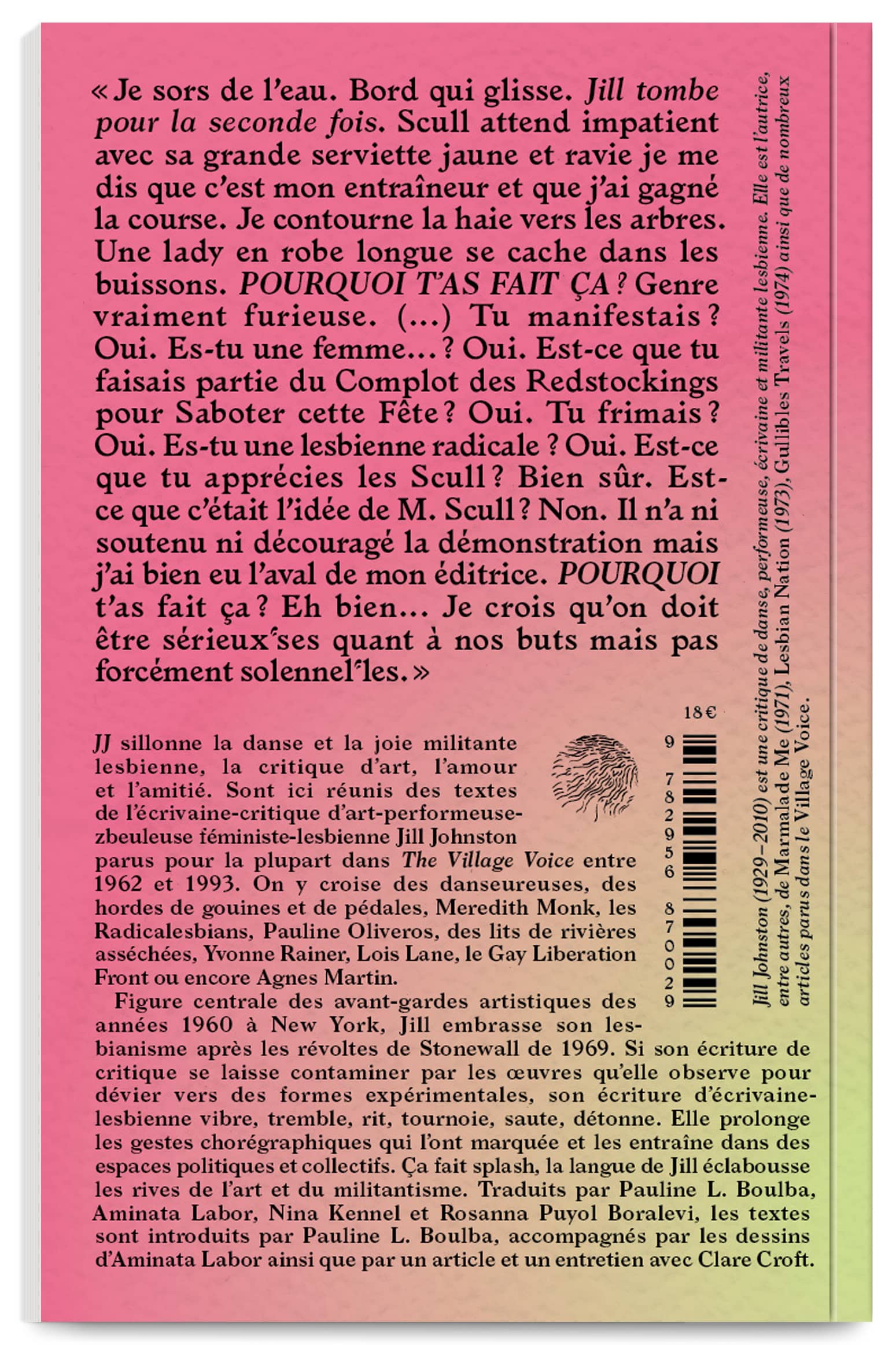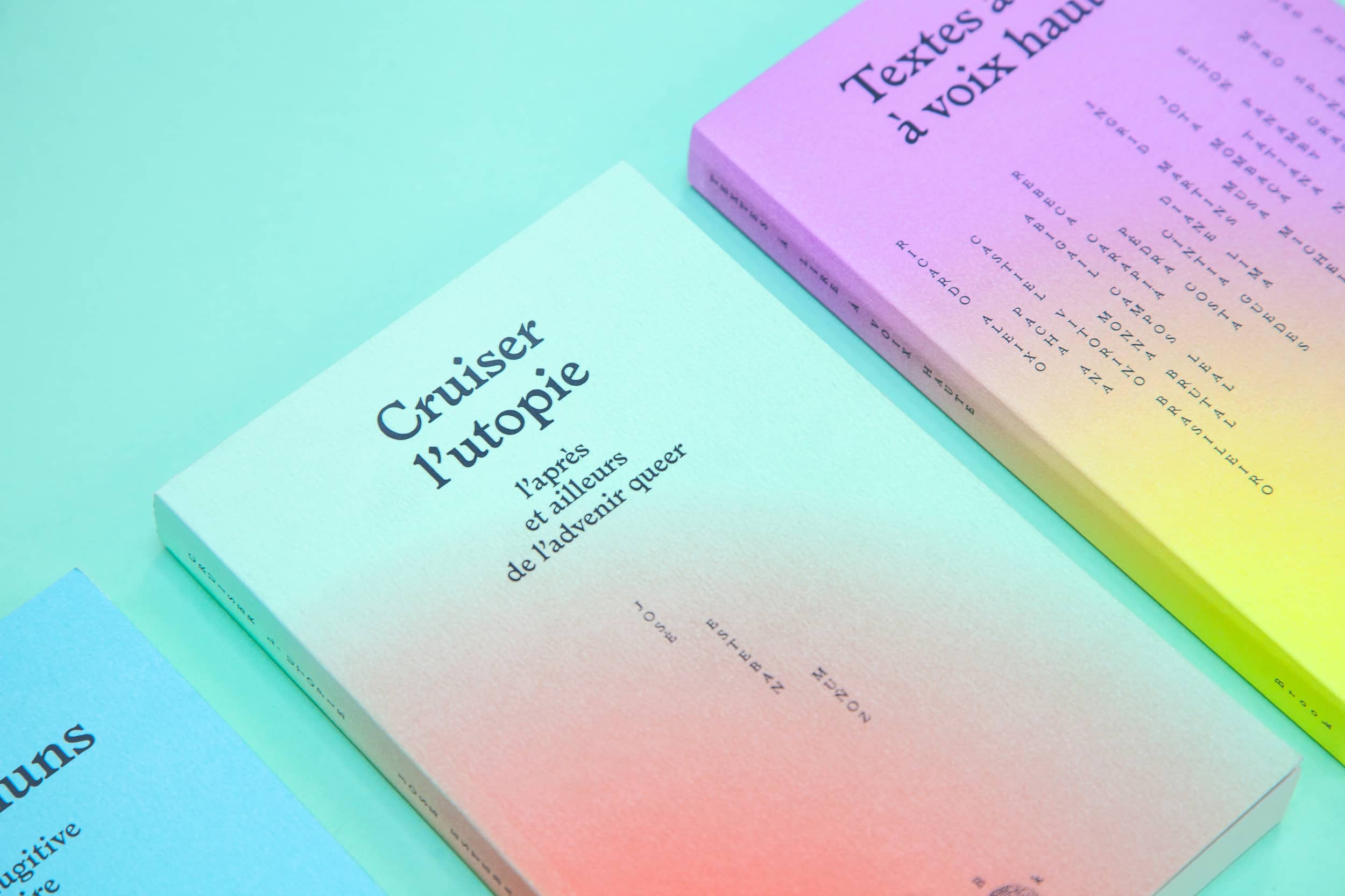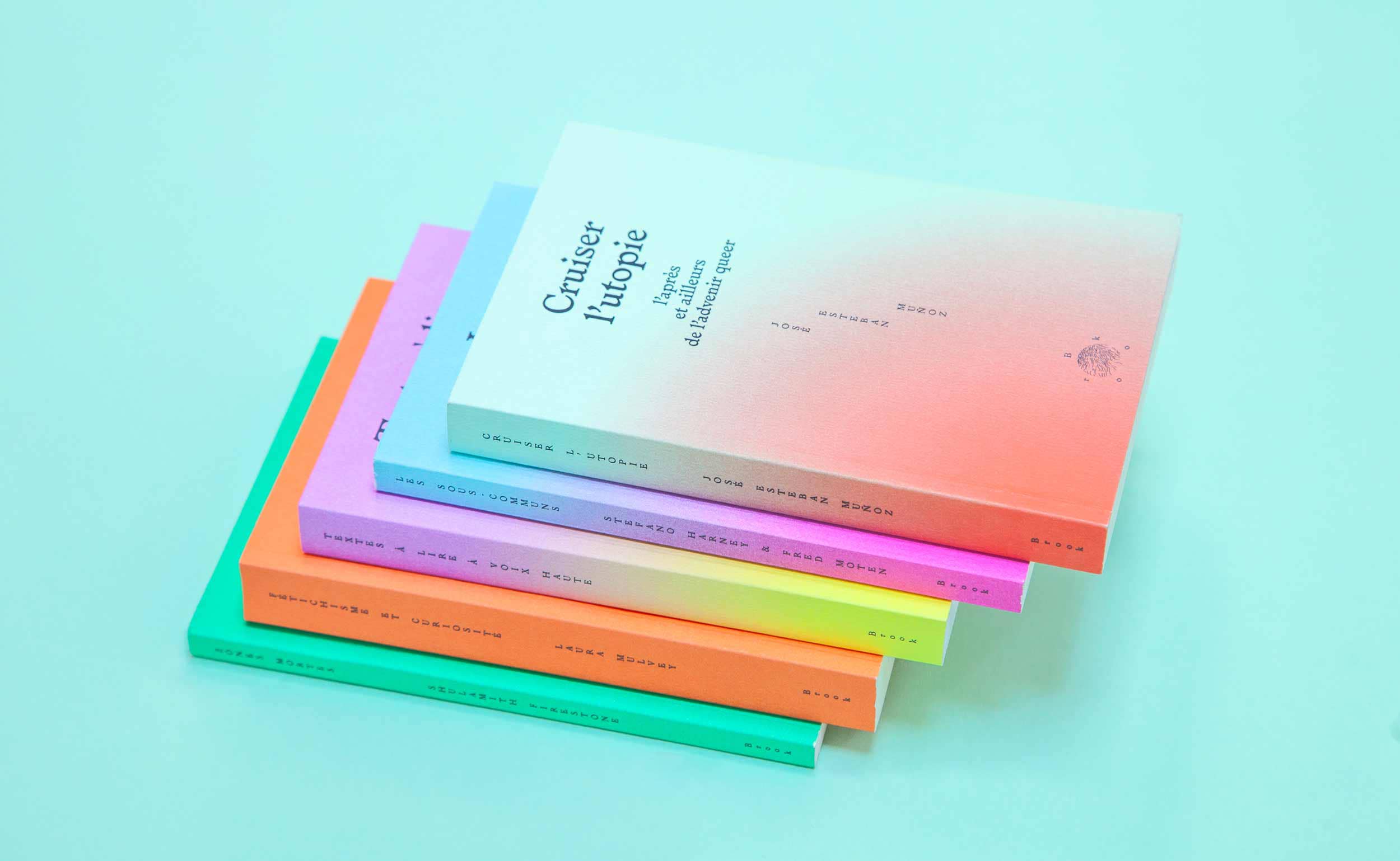 We explore this dot as a space for power and better representation. In Jill Johnston’s book, we replaced it with a “lesbian splash”, an expression used by Clare Croft to describe Johnston as disrupting and hacking the public space given to her. It also refers to a text where she describes making a literal splash by swimming topless in the pool at her book release party. We turned the dot into an asterisk — a “queer sparkle”, as Sam Bourcier calls it — to overcome the male-female duality and also represent non-binary gender. For Muñoz’s Cruising Utopia, we worked with Roxanne Maillet (Bye Bye Binary) to produce a series of inclusive sparkles.