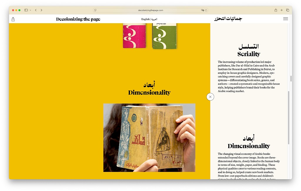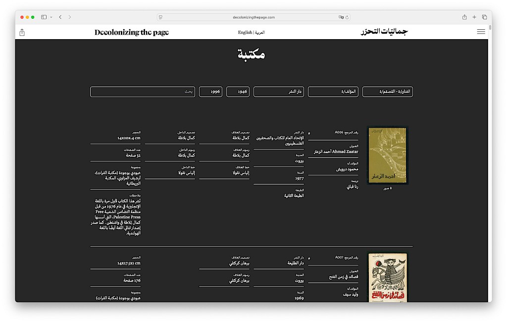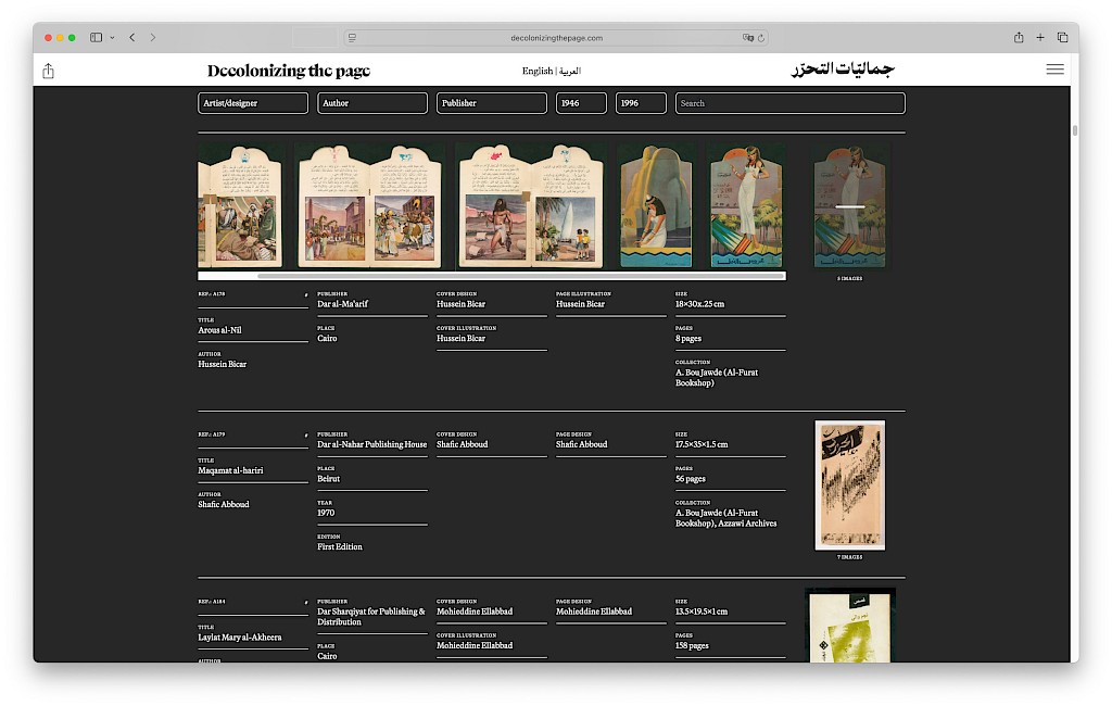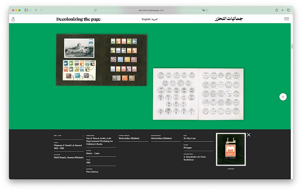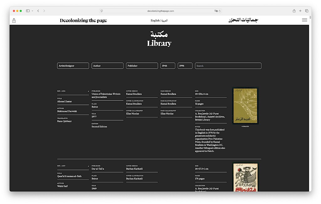 Decolonizing the Page: A Forgotten Golden Age of Arabic Book Arts (1950s–80s) is an online exhibition and archival resource that sheds light on a remarkable era when Arabic book arts flourished, mirroring the artistic, political, and intellectual fervour of decolonization. It contains more than 250 books and presents the work of a generation of Arab artists from Egypt, Iraq, Lebanon, Palestine and Syria. A bilingual resource designed between Beirut, London and Paris. Visit the online exhibition at: https://www.decolonizingthepage.com