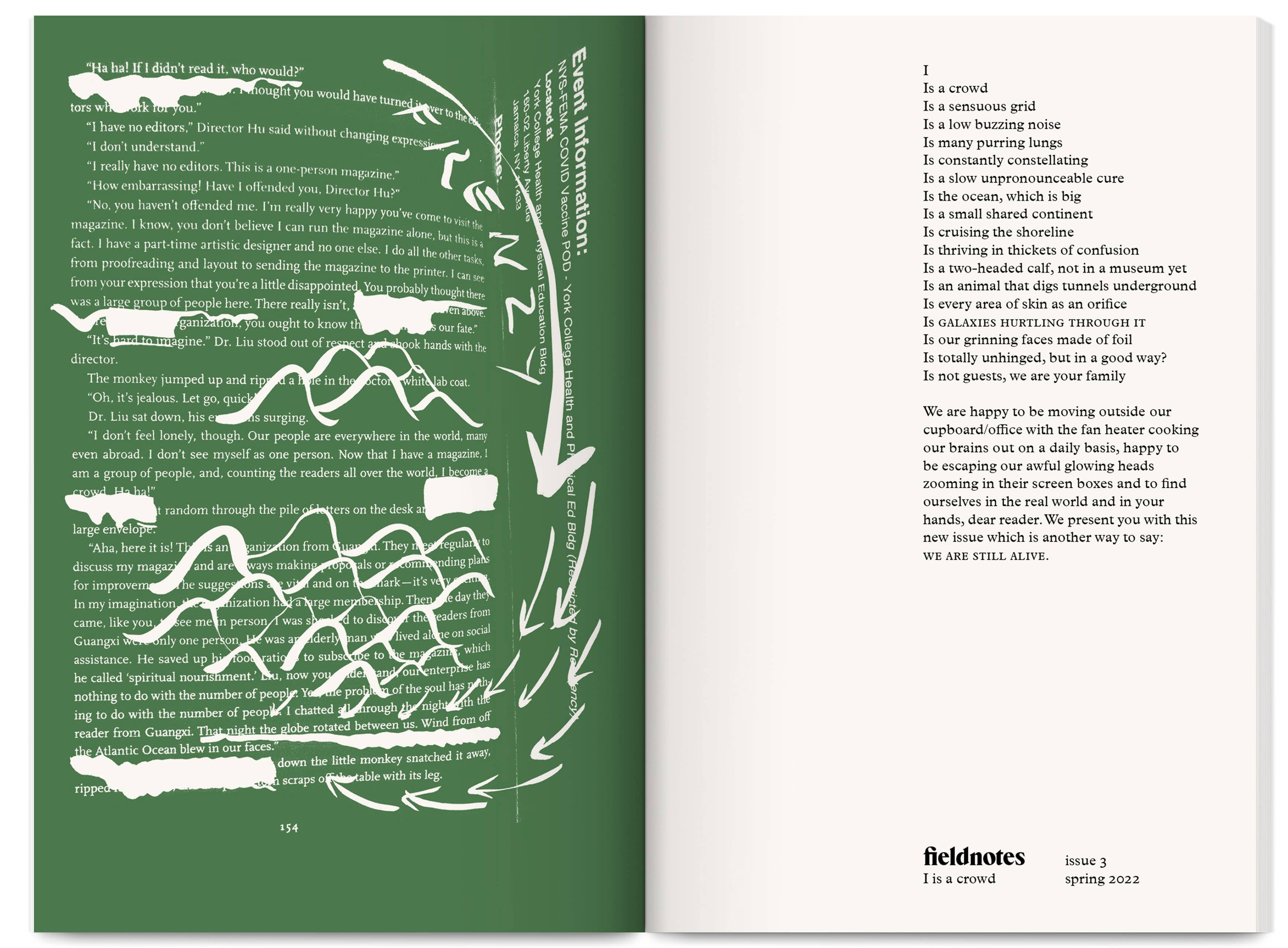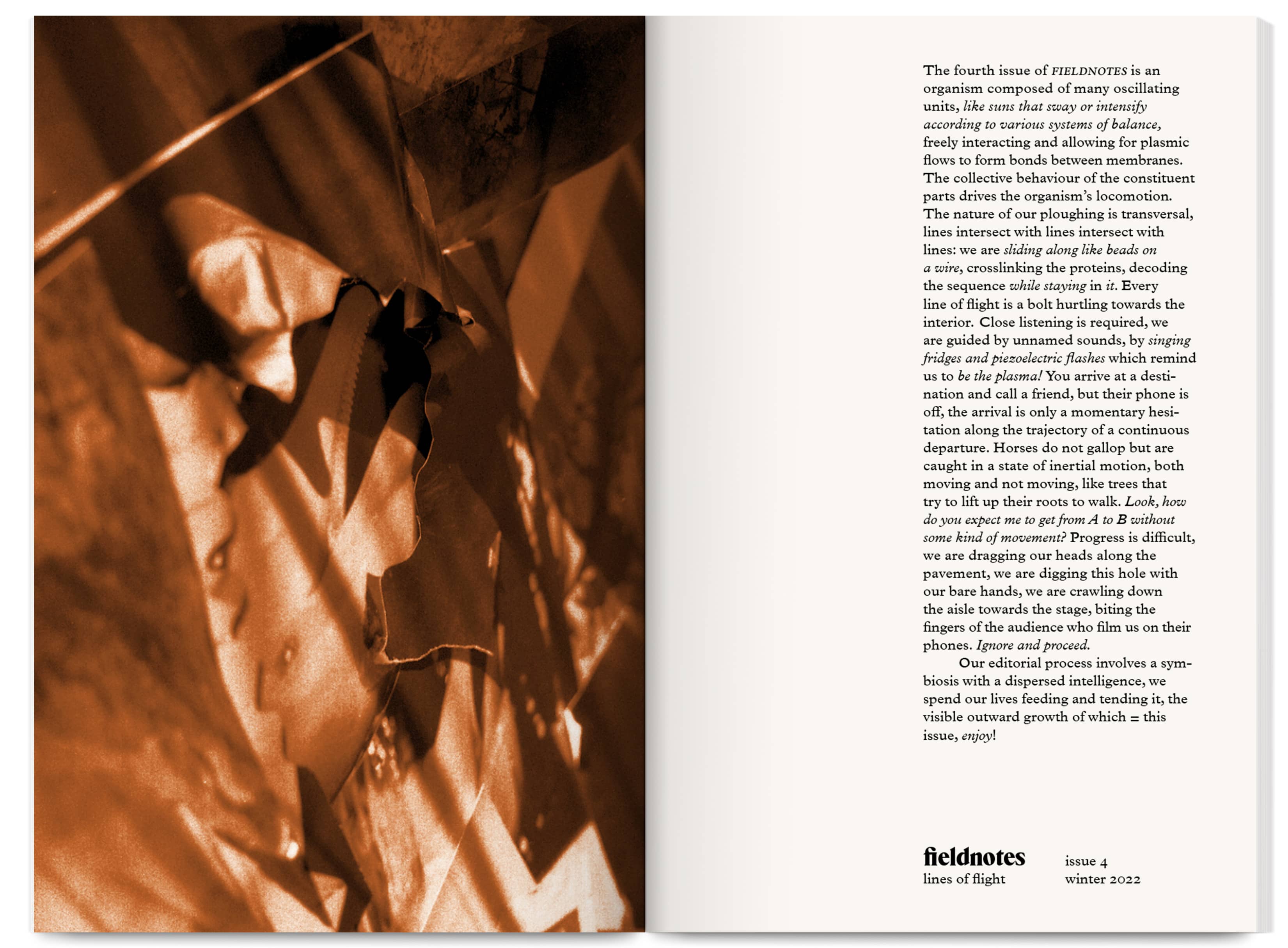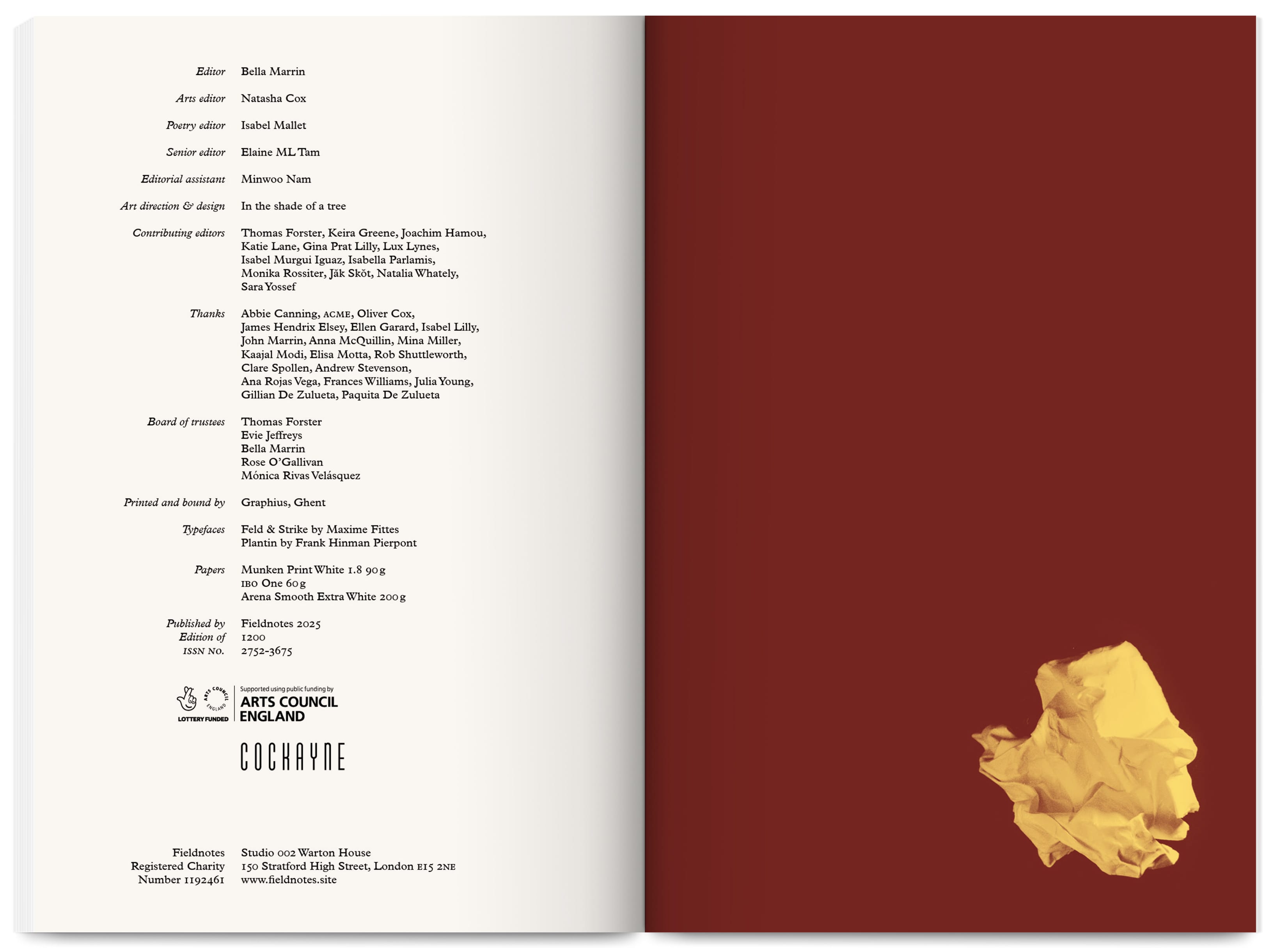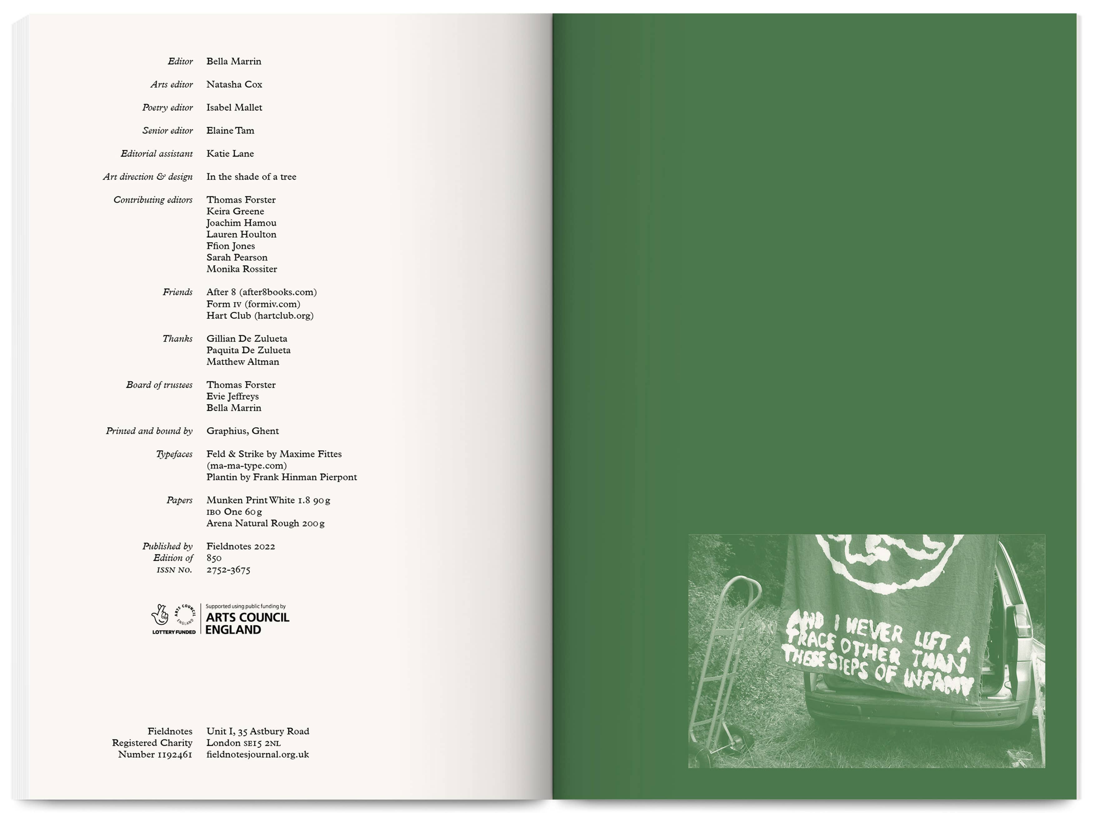 Fieldnotes is an East London artist-run publishing project producing an annual print journal and public programme of workshops, mentoring, radio, screenings and readings. It promotes non-conforming creative practices that challenge arts inequalities, supporting new voices, interdisciplinary experimentation and the “third thing” between known forms — the spaces between translations and transitions.