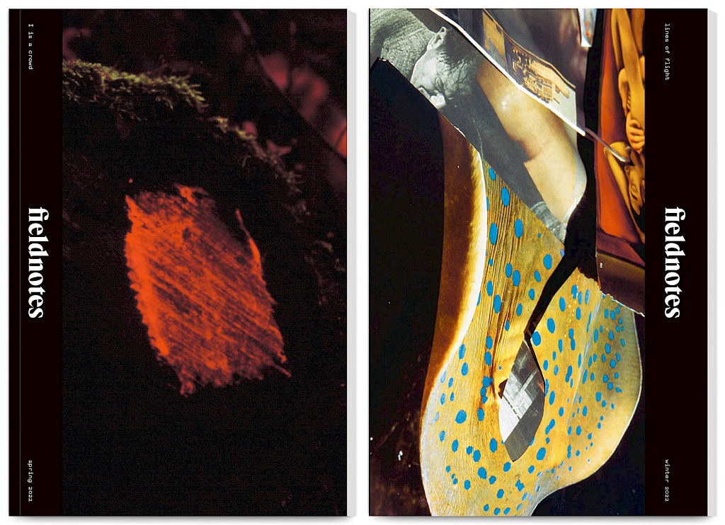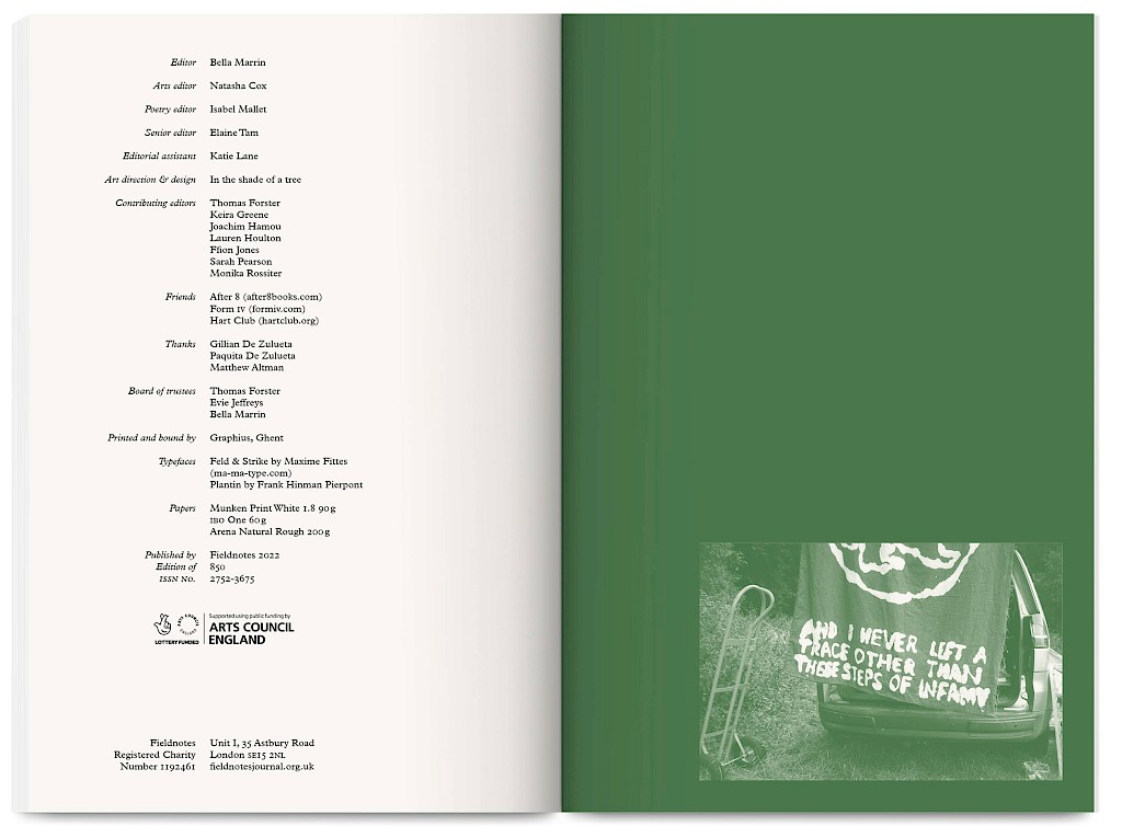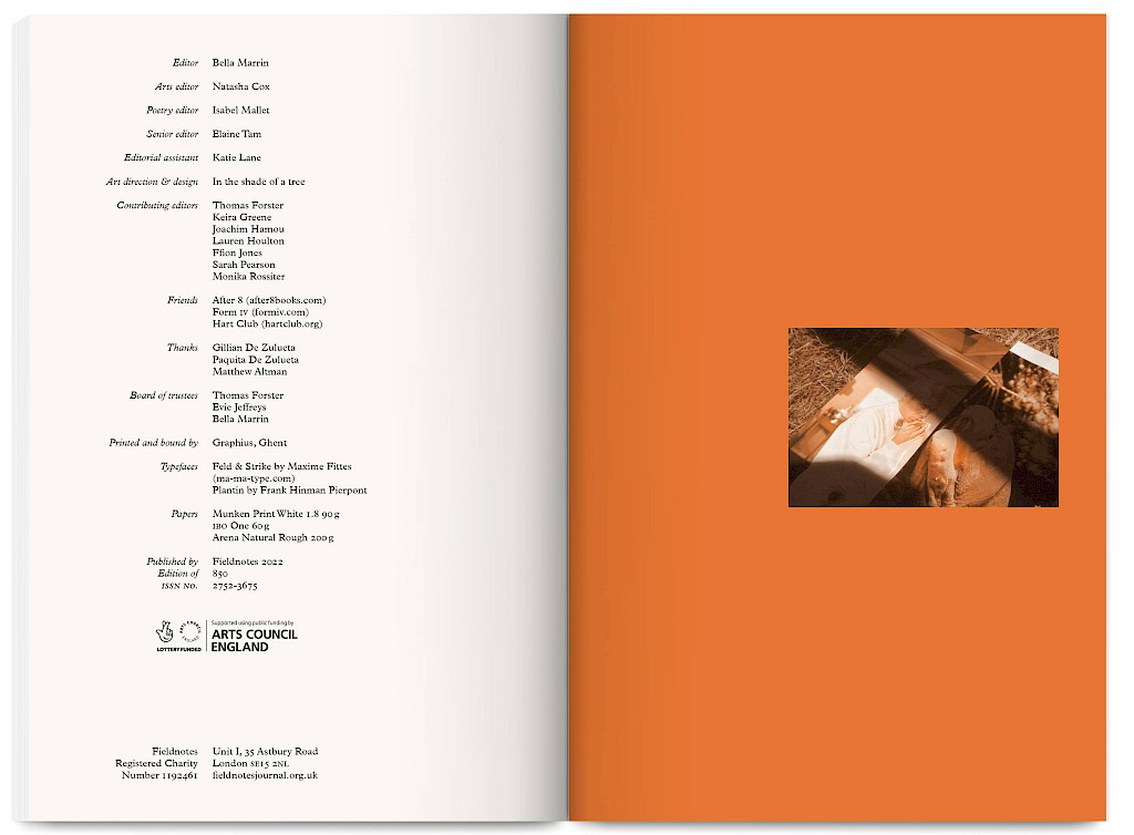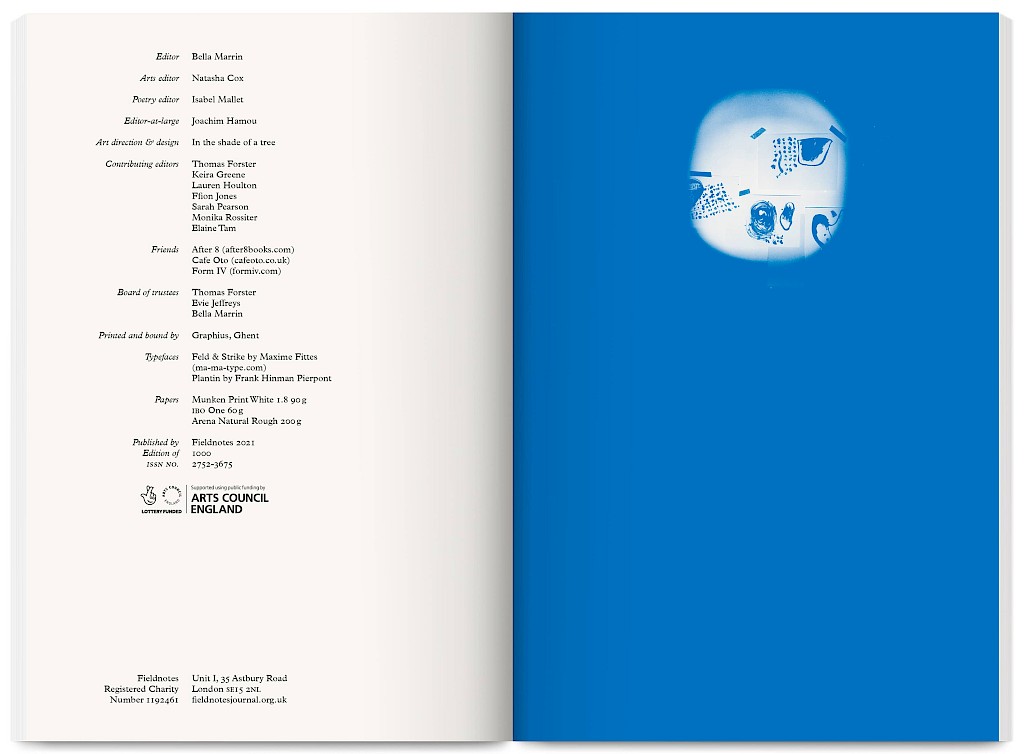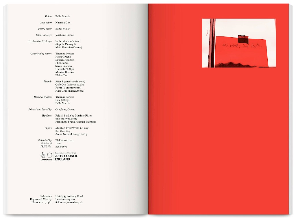 Fieldnotes is an East London artist-run publishing project producing an annual print journal and public programme of workshops, mentoring, radio, screenings and readings. It promotes non-conforming creative practices that challenge arts inequalities, supporting new voices, interdisciplinary experimentation and the “third thing” between known forms — the spaces between translations and transitions.
