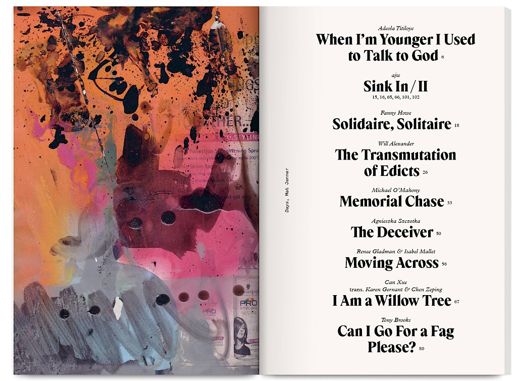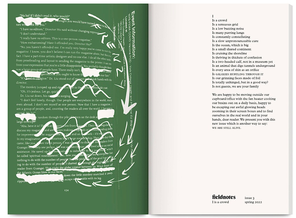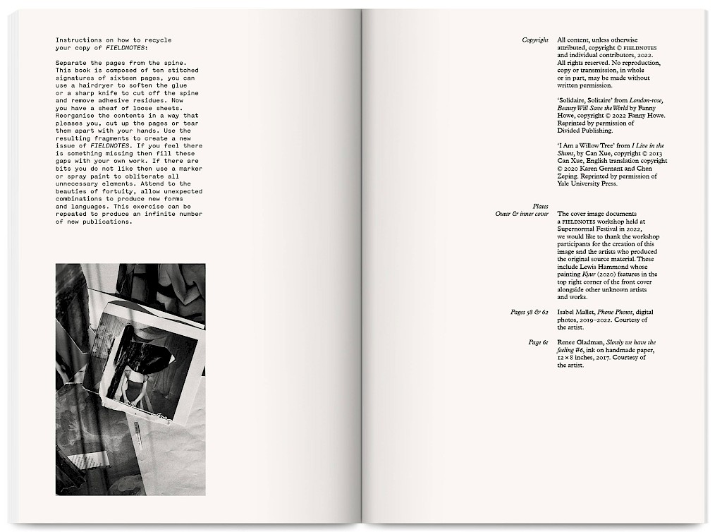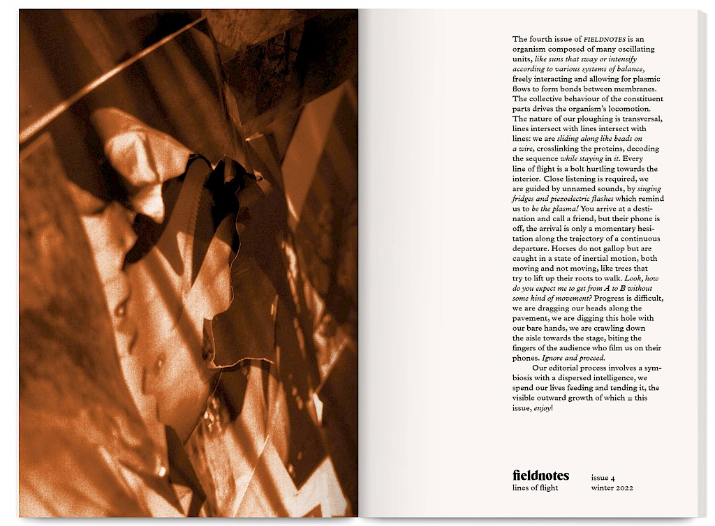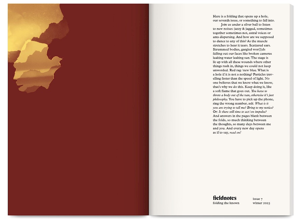 Fieldnotes is an East London artist-run publishing project producing an annual print journal and public programme of workshops, mentoring, radio, screenings and readings. It promotes non-conforming creative practices that challenge arts inequalities, supporting new voices, interdisciplinary experimentation and the “third thing” between known forms — the spaces between translations and transitions.