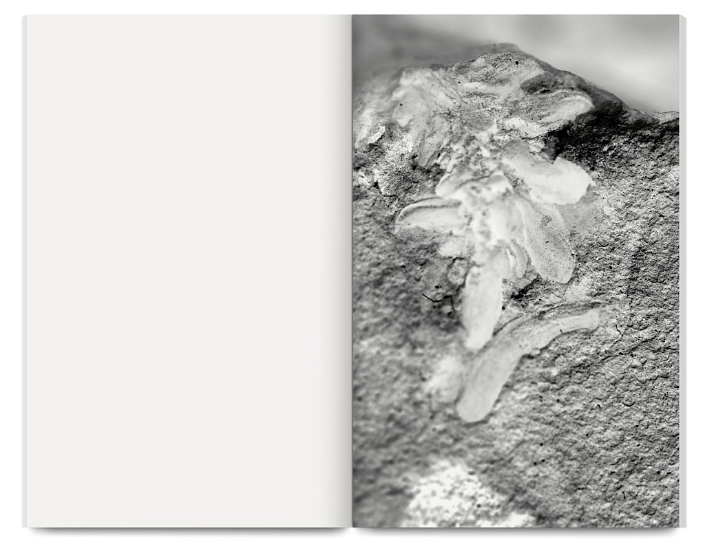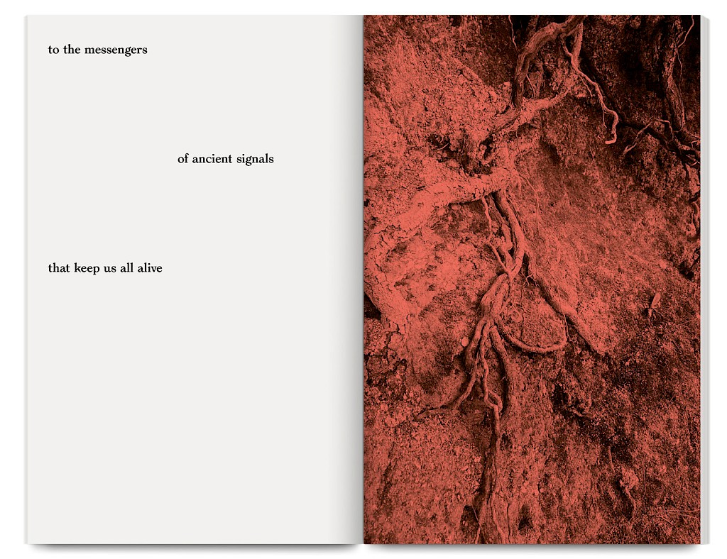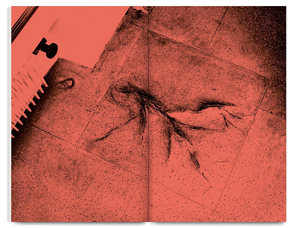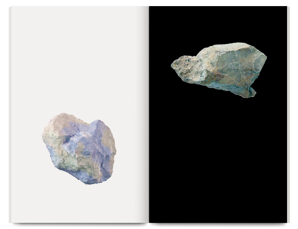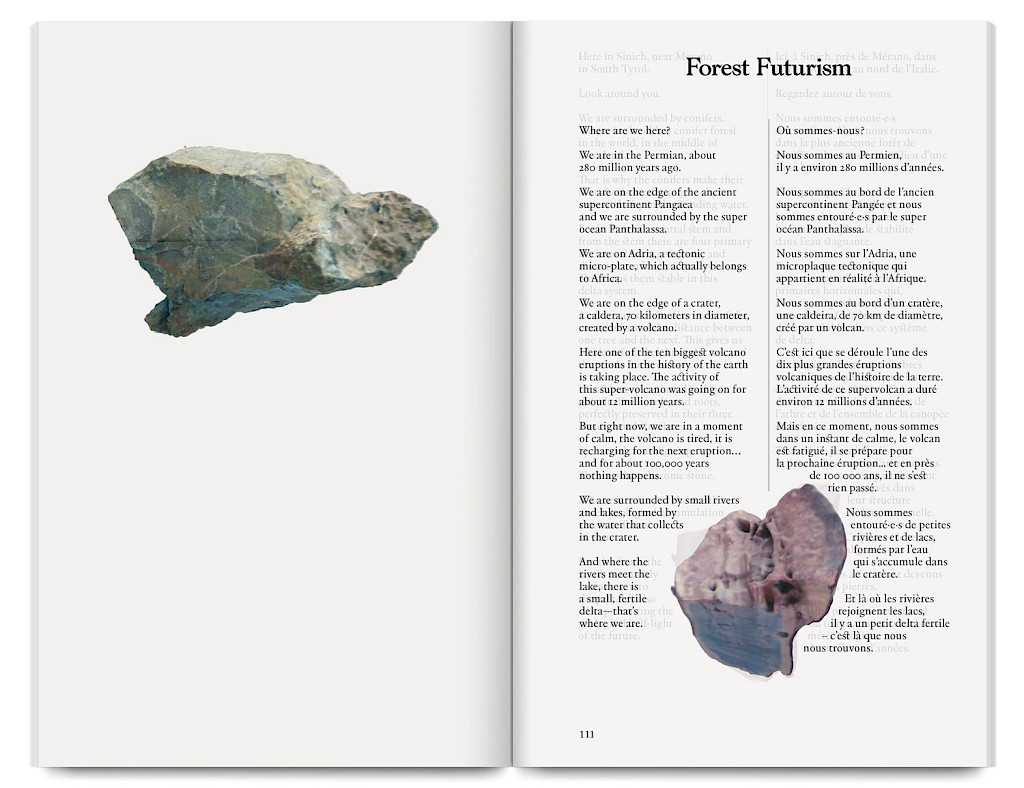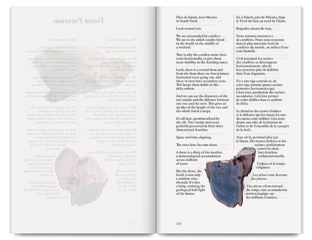 We designed this catalogue as a compact, portable object with a fluorescent, holographic cover, borrowing from the visual language of science‑fiction novels and breaking away from traditional art catalogues. The book does not aim to be a perfect record of the works but rather a translation that gives a different perspective onto them, whether through their new materiality (paper texture, transparency) or their new colour (duotone printing of the work Dedication).