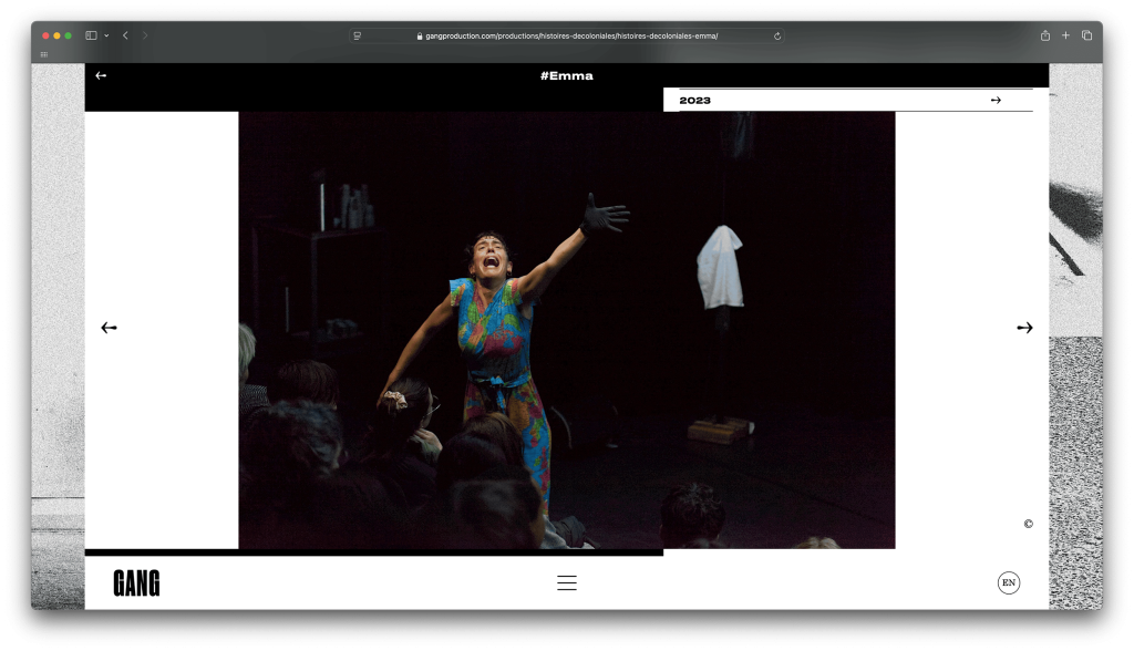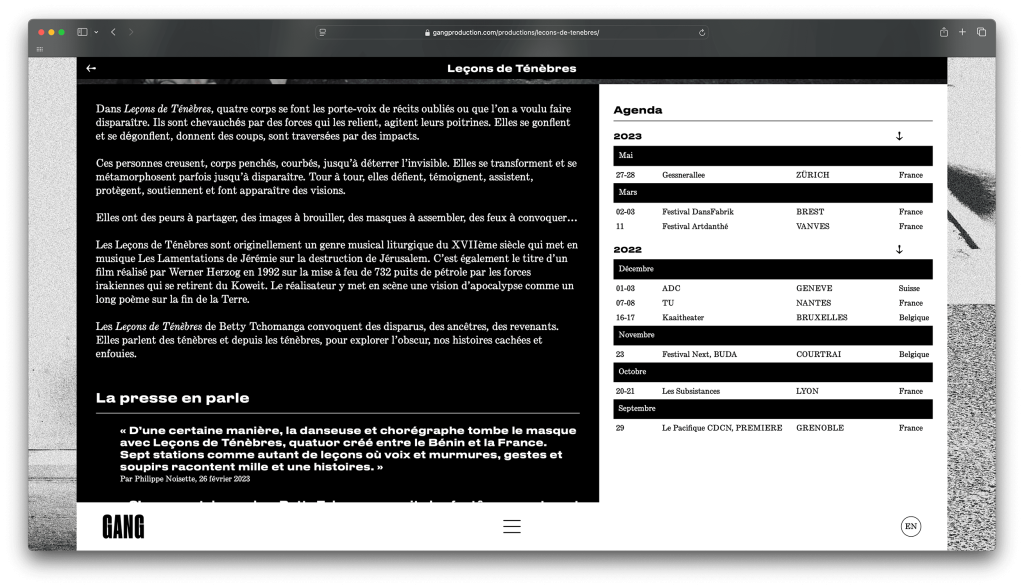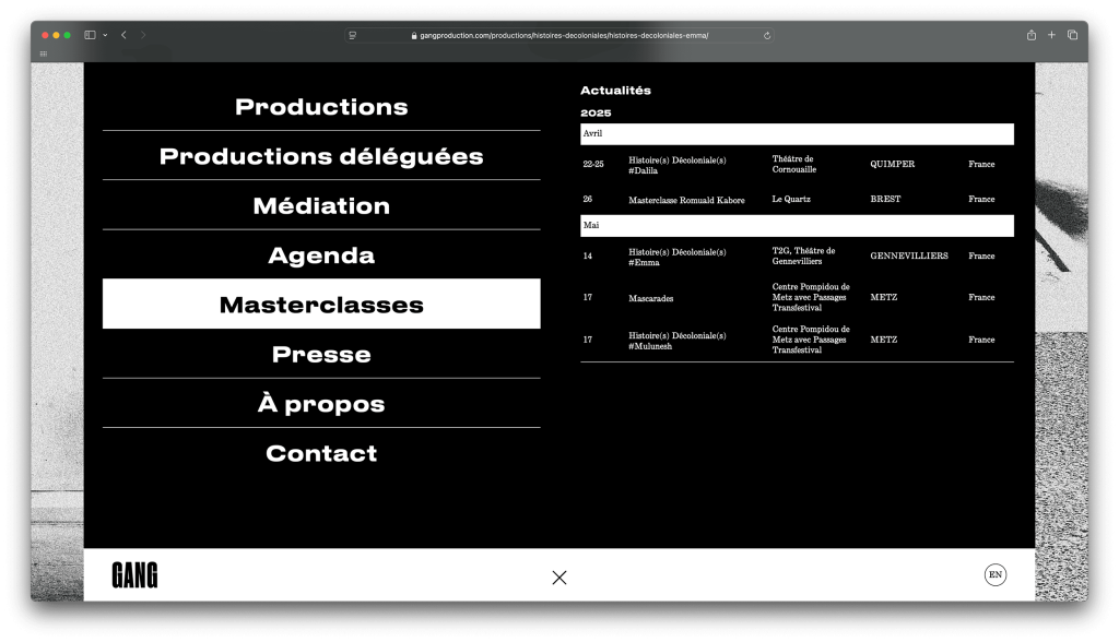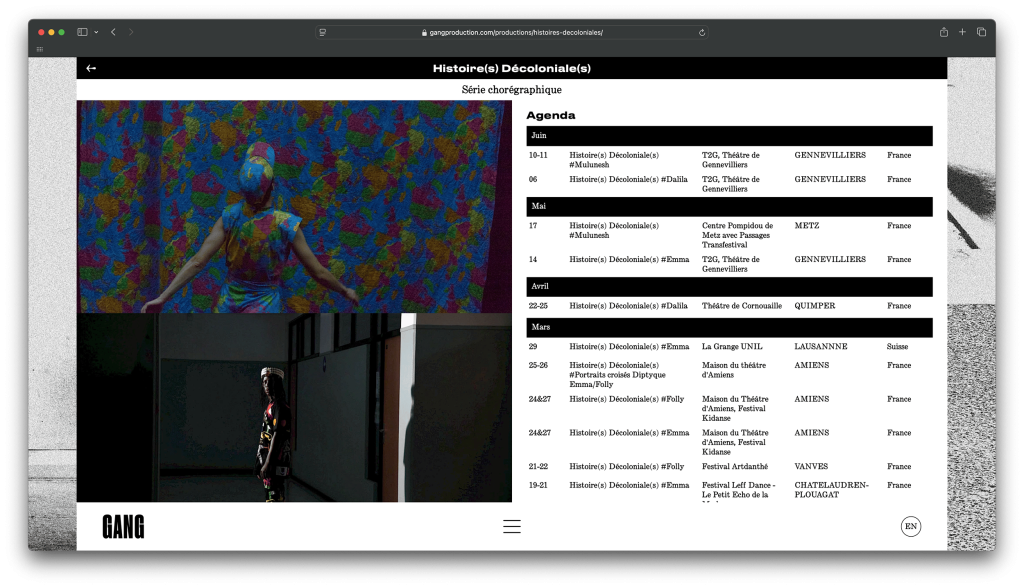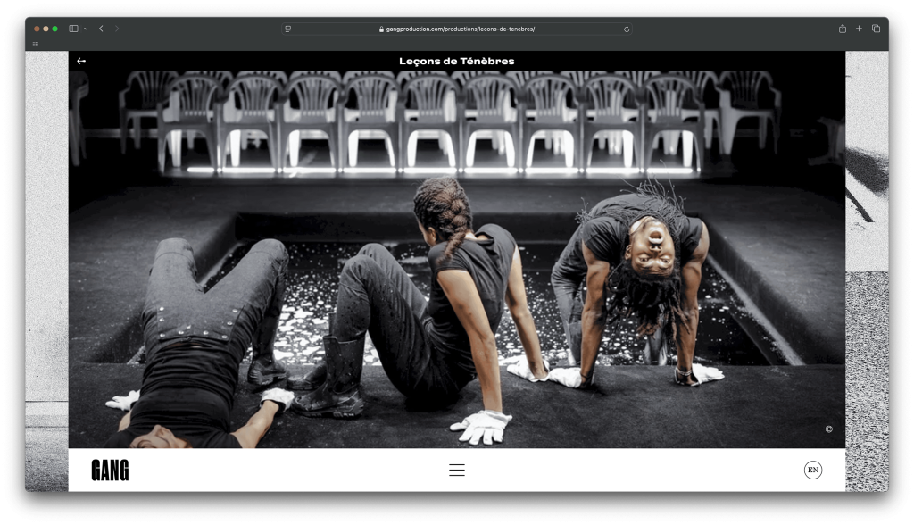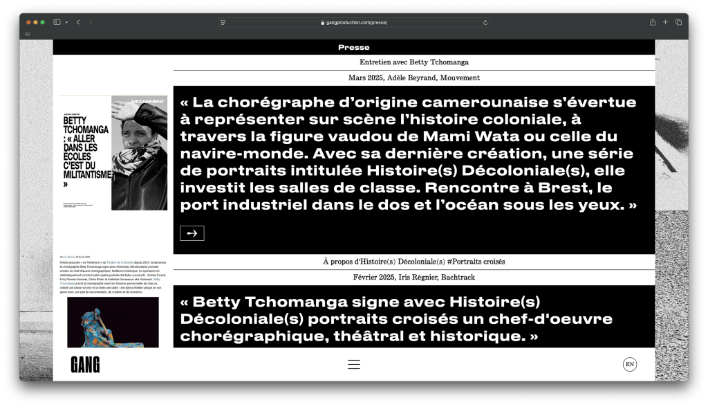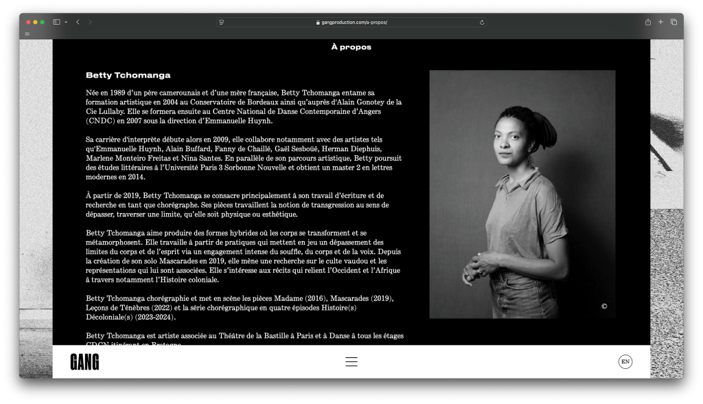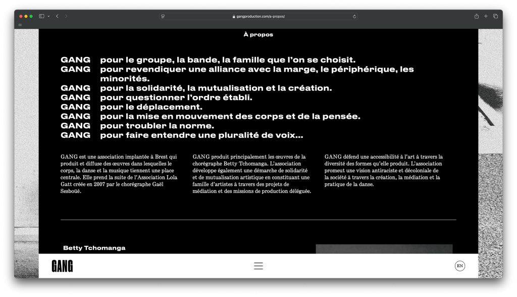 GANG, a Brest‑based dance company founded by choreographer Betty Tchomanga, centres its works on the body, dance and music; it fights for accessibility to art through the diversity of the forms it produces. The company promotes an anti‑racist and decolonial vision of society through the creation and practice of dance.