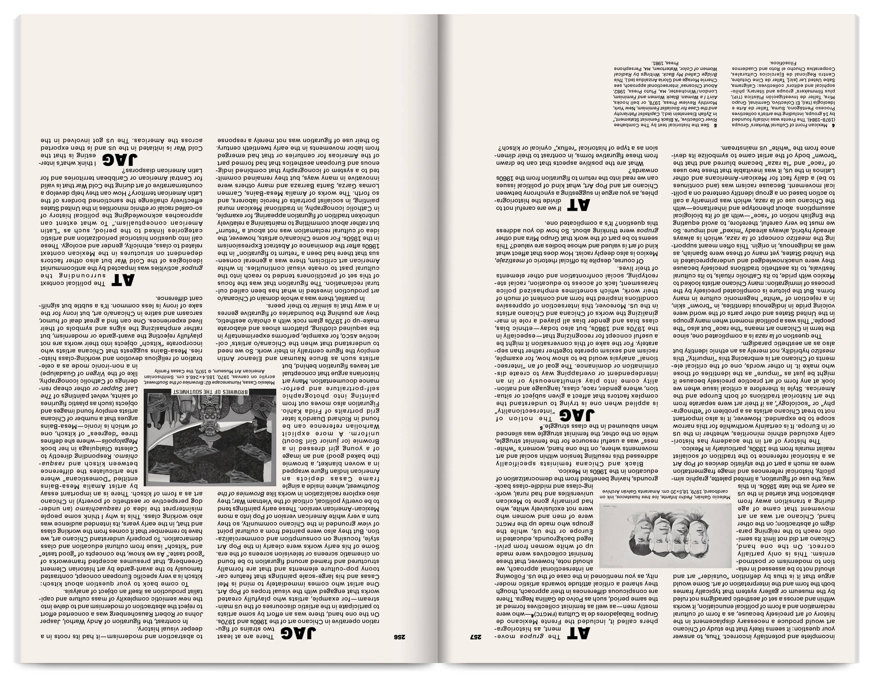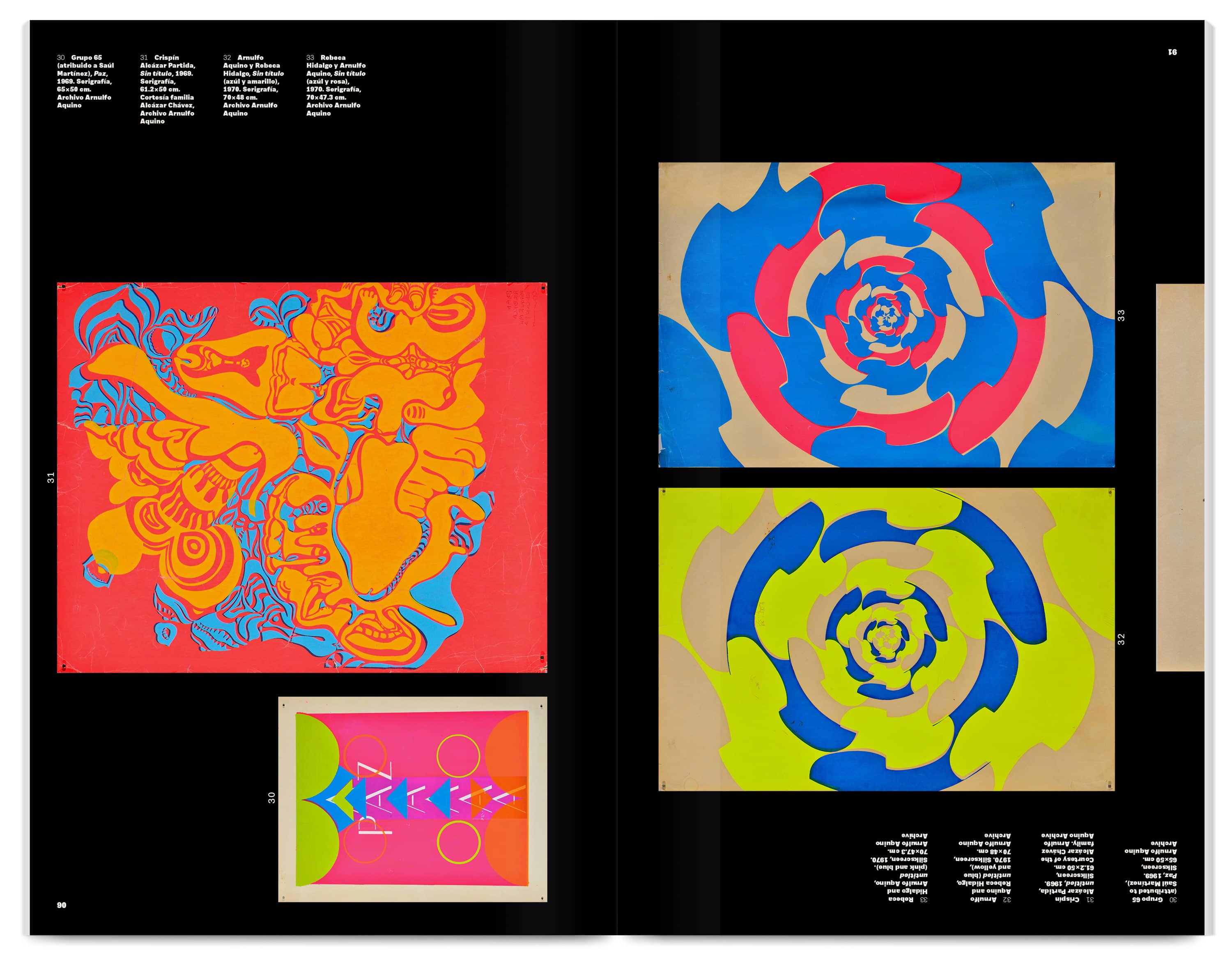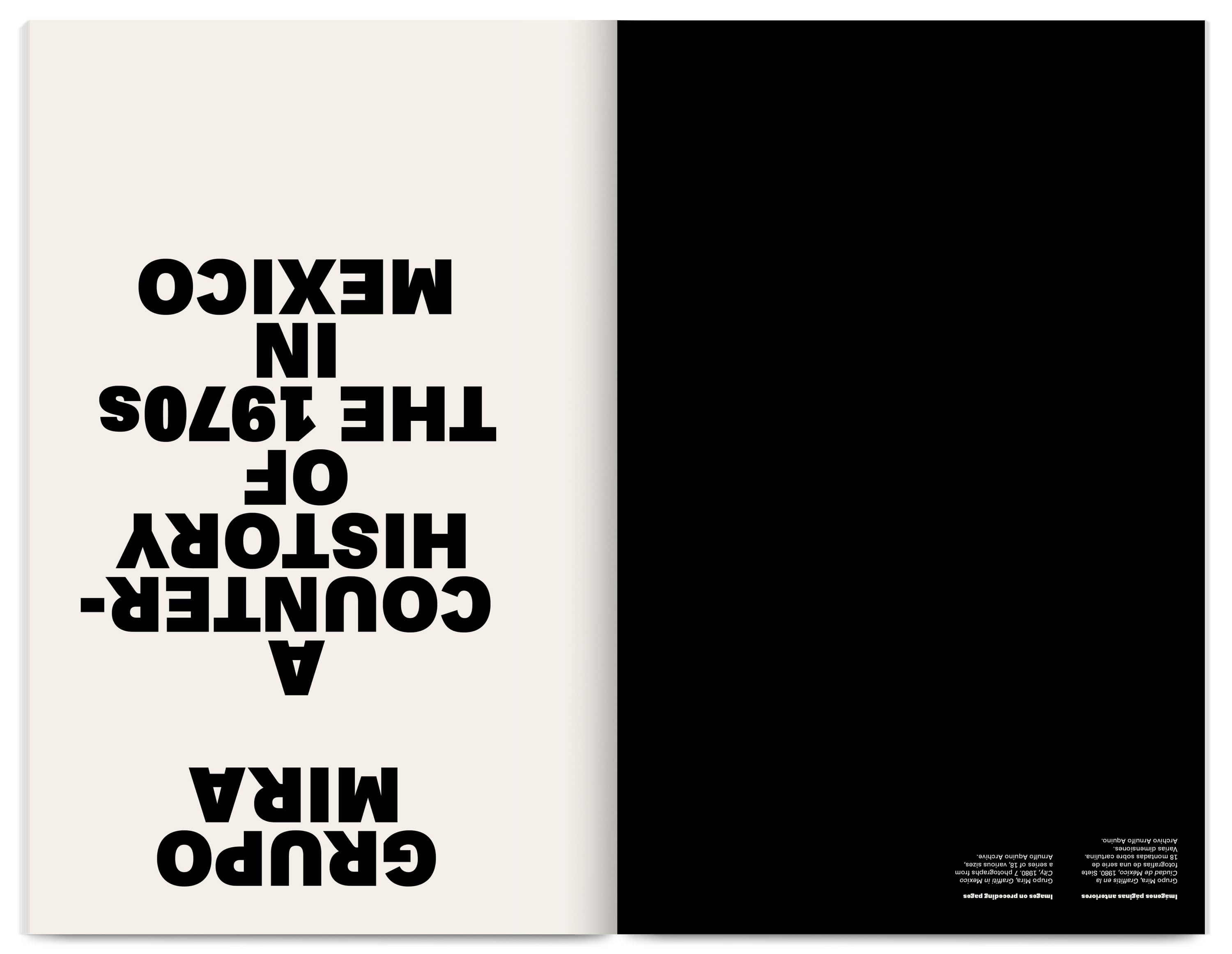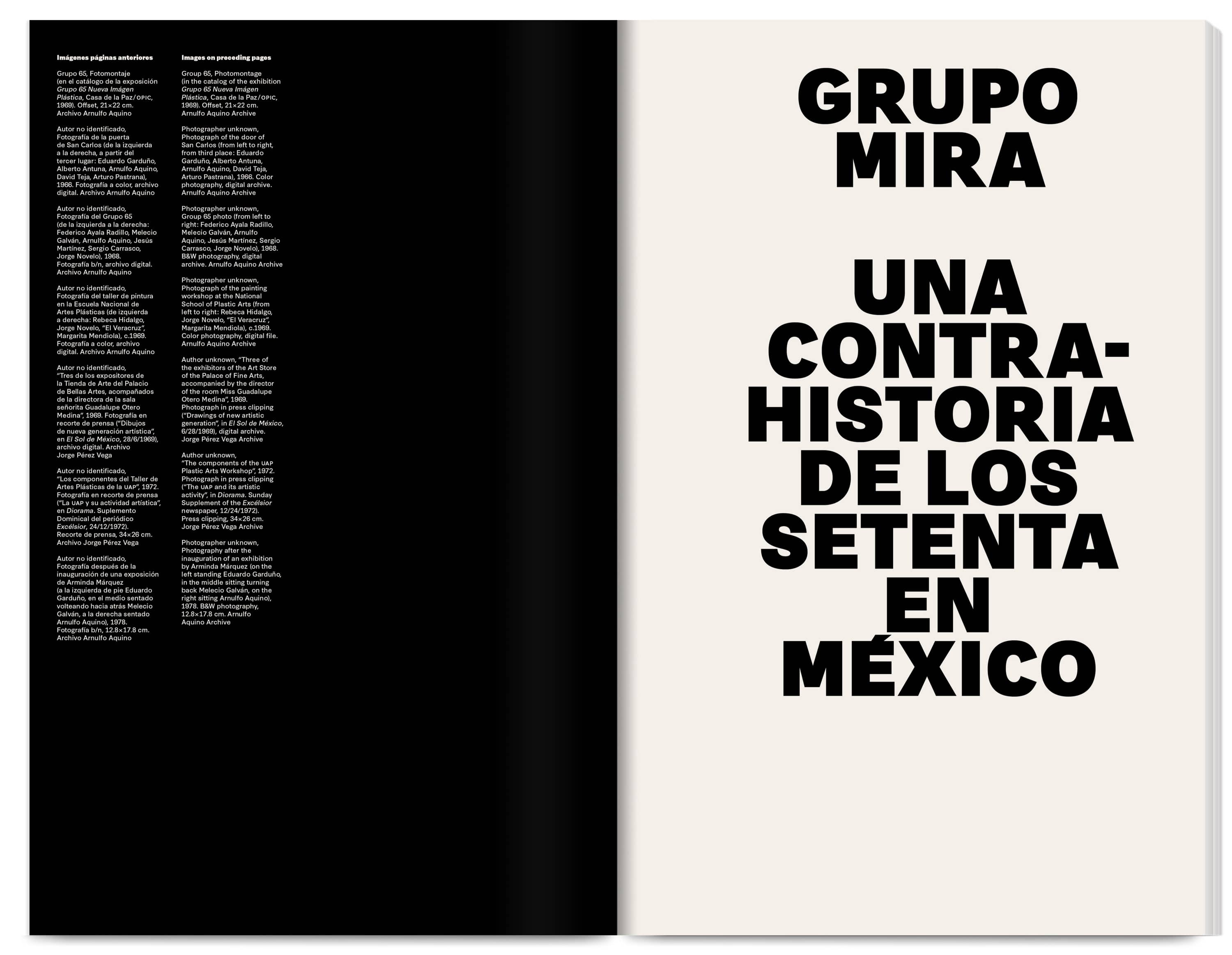 The 300‑page catalogue is printed dos‑à‑dos (back‑to‑back and inverted), acknowledging the two languages (Spanish and English) as a visible structural feature. Each side has its own cover and an introductory section with black‑and‑white archive photographs, essays and a conversation giving context to the Group’s visual works. The core of the publication showcases a comprehensive selection of these works, accompanied by facsimiles, short essays and interviews produced at the time.