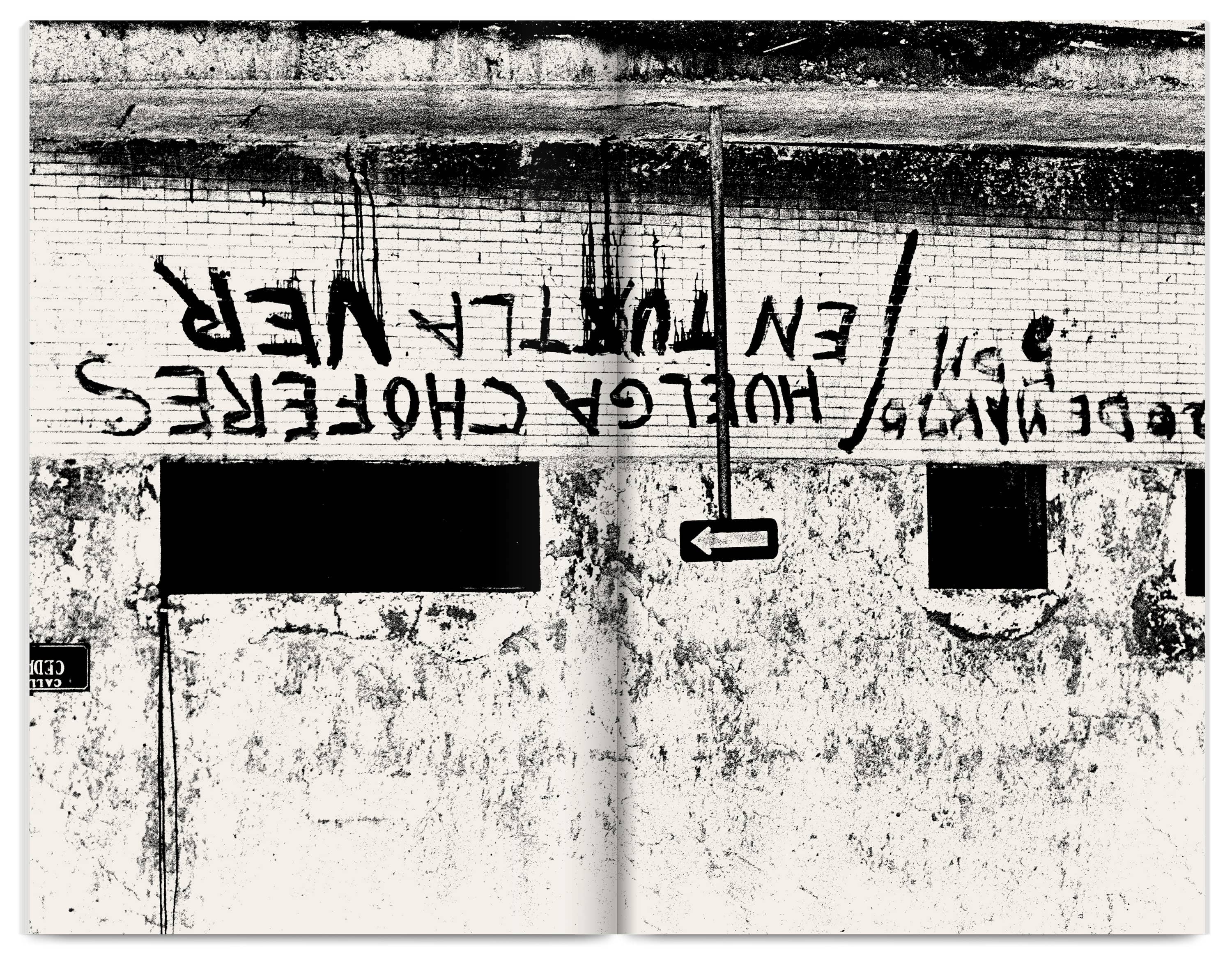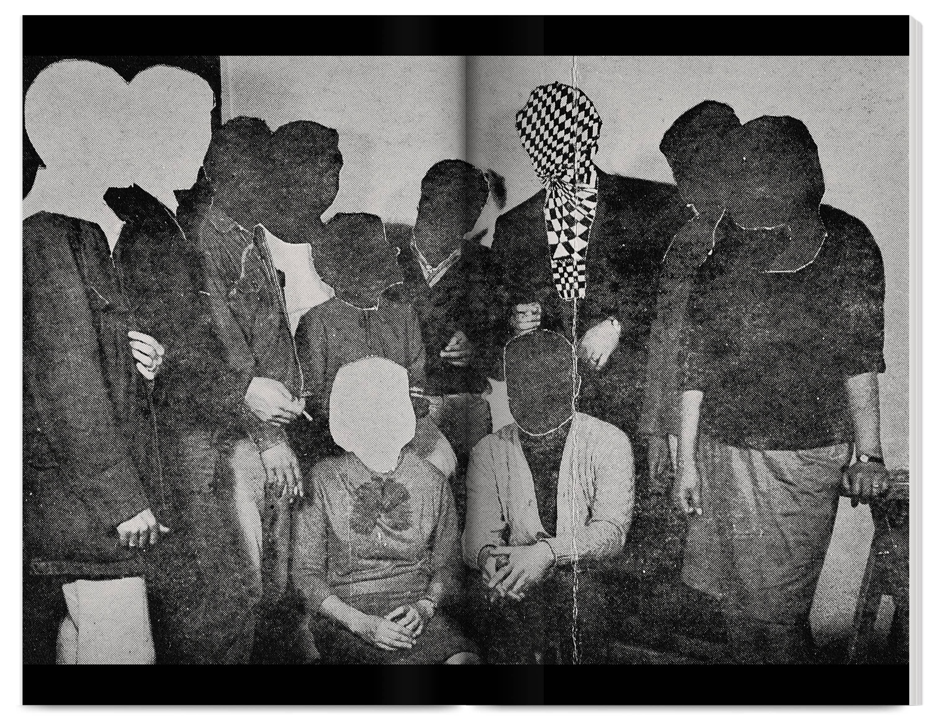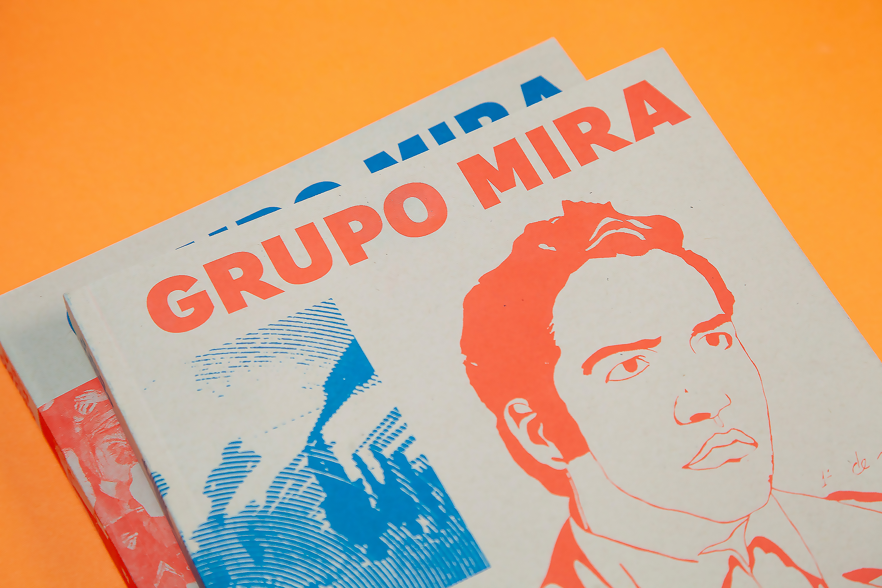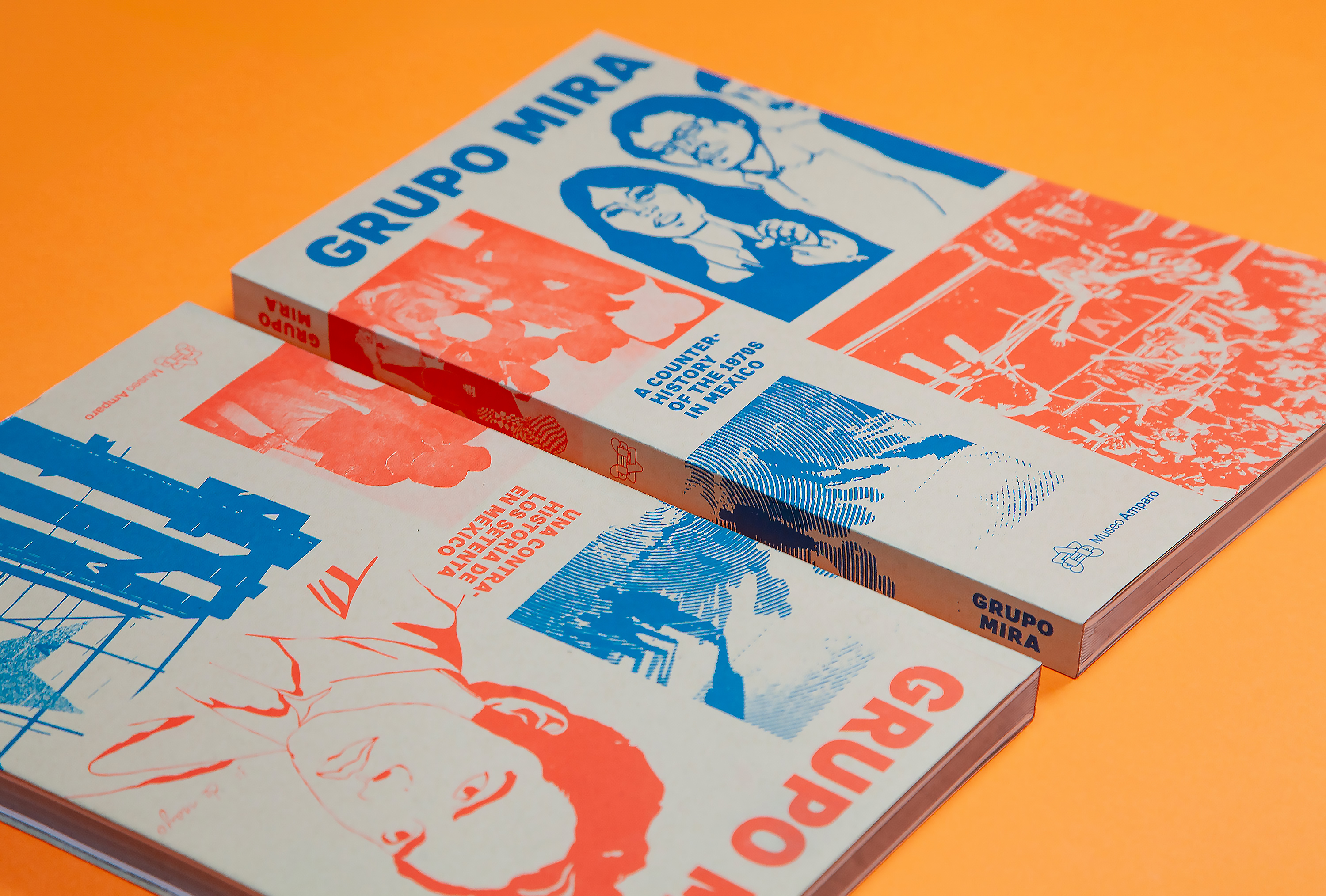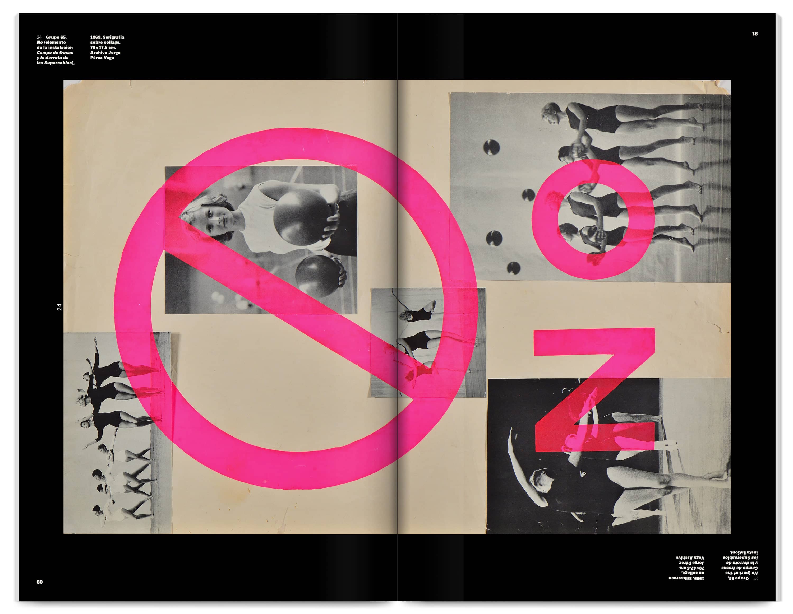 The 300‑page catalogue is printed dos‑à‑dos (back‑to‑back and inverted), acknowledging the two languages (Spanish and English) as a visible structural feature. Each side has its own cover and an introductory section with black‑and‑white archive photographs, essays and a conversation giving context to the Group’s visual works. The core of the publication showcases a comprehensive selection of these works, accompanied by facsimiles, short essays and interviews produced at the time.