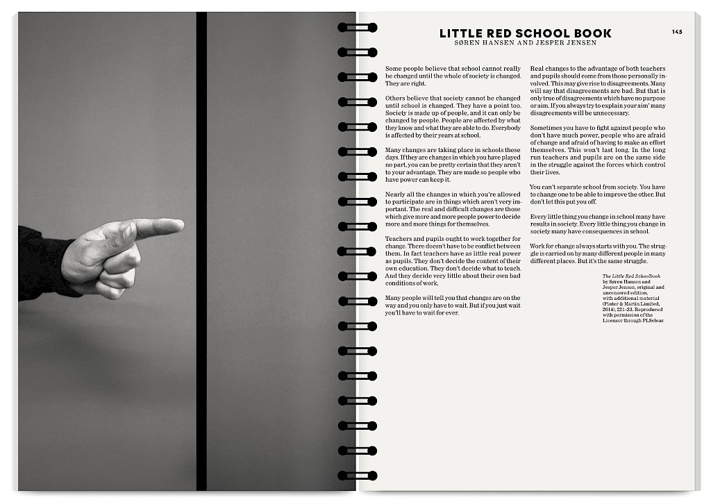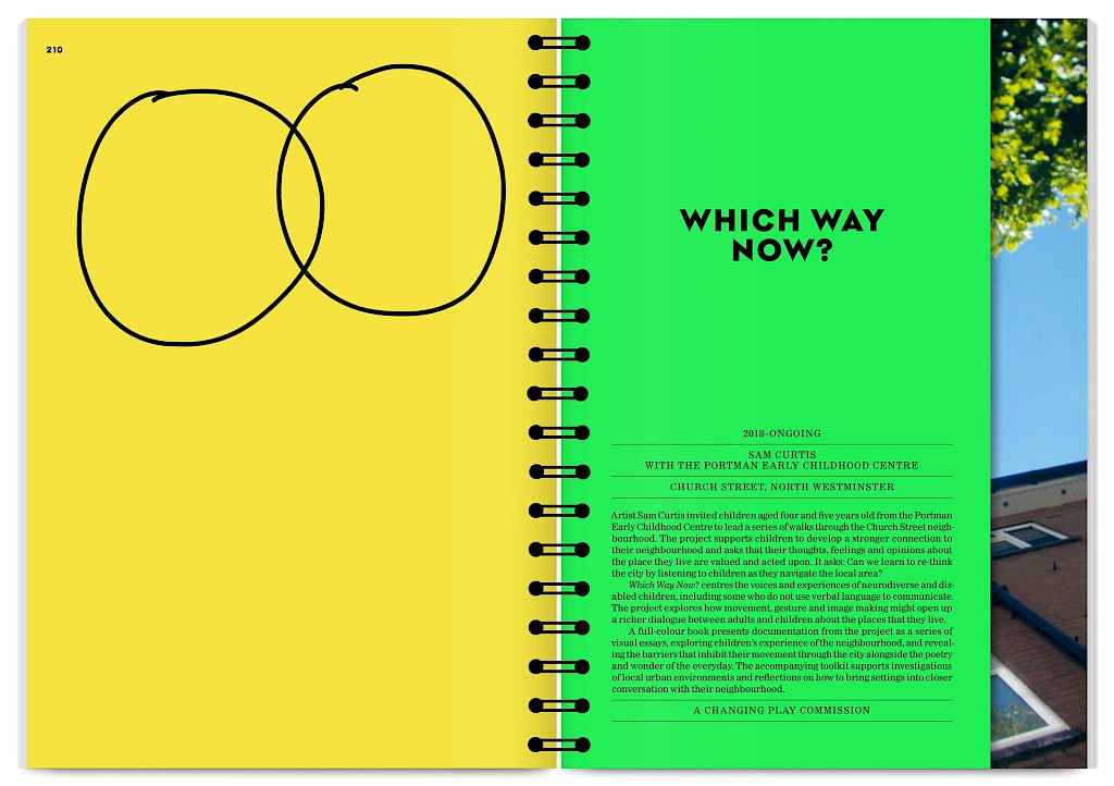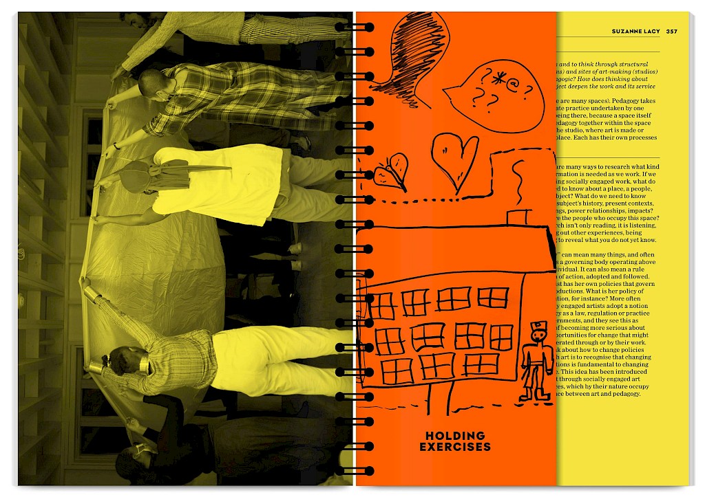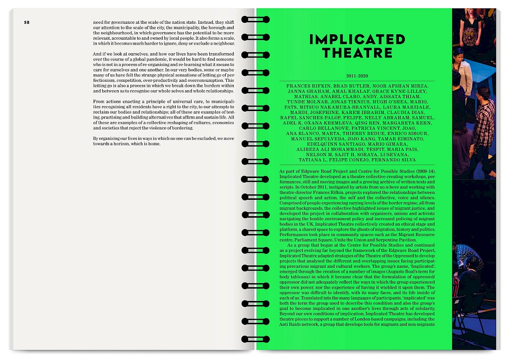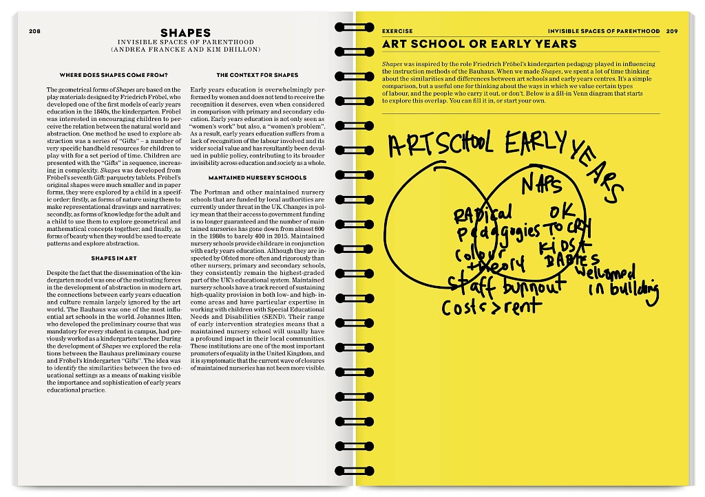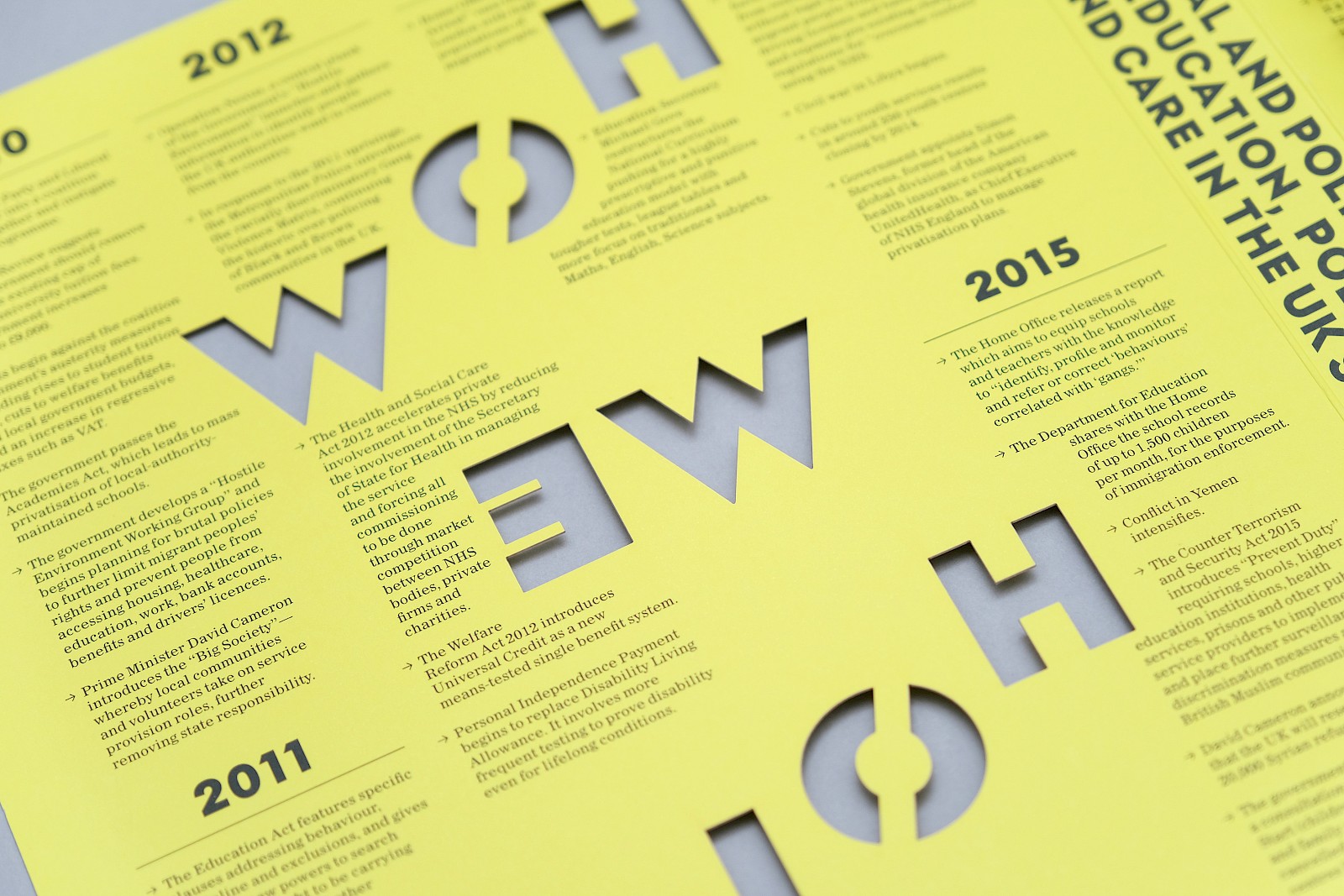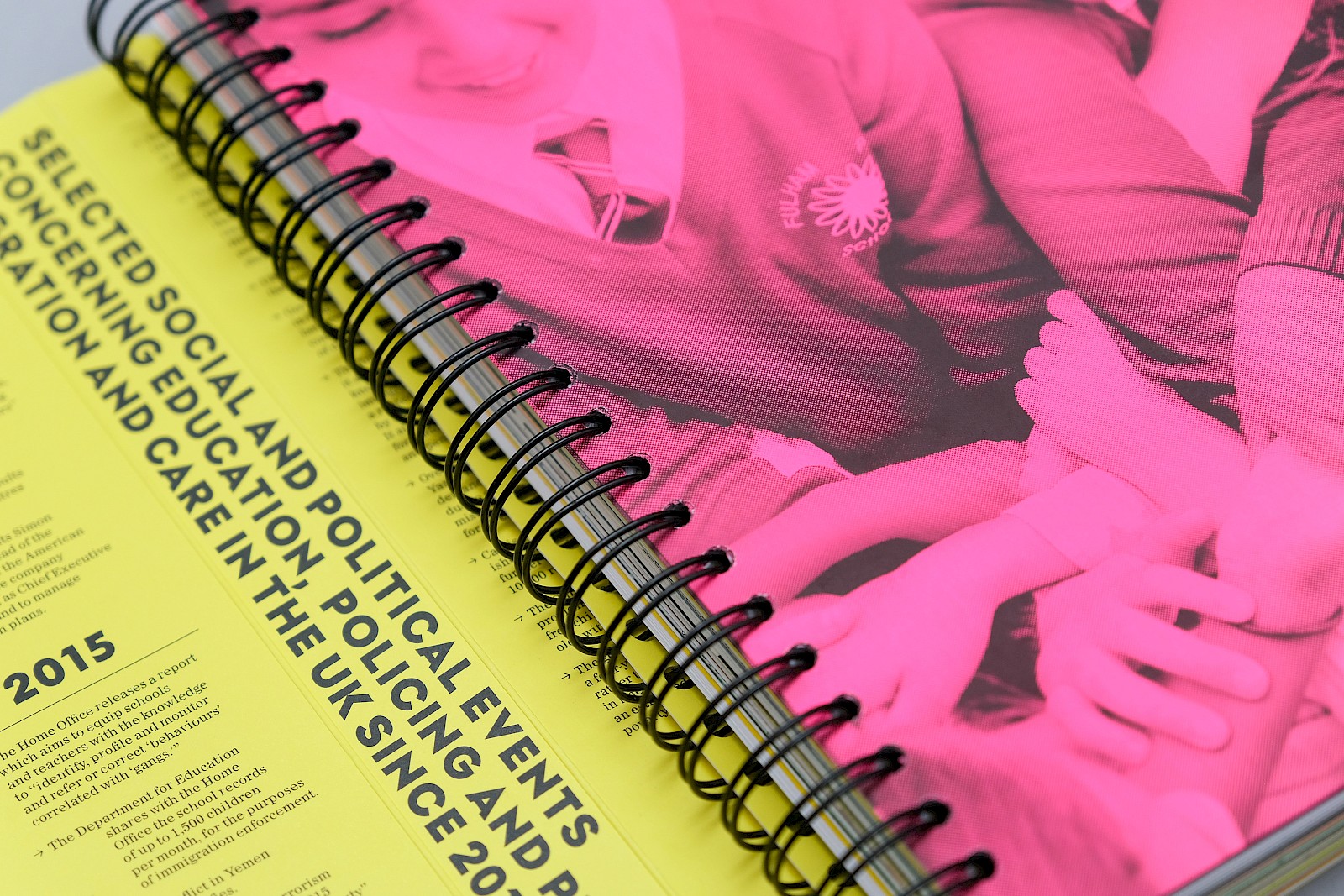 The publication adopts the standardised A4 format for easy photocopying and borrows its fluorescent paper colours from Post-it notes commonly used in the workshops. The cover features a long fold with the title cut out to reveal the first page beneath. When unfolded, it displays a timeline of over ten years of UK political events, providing meaningful context for the art projects presented inside the book.