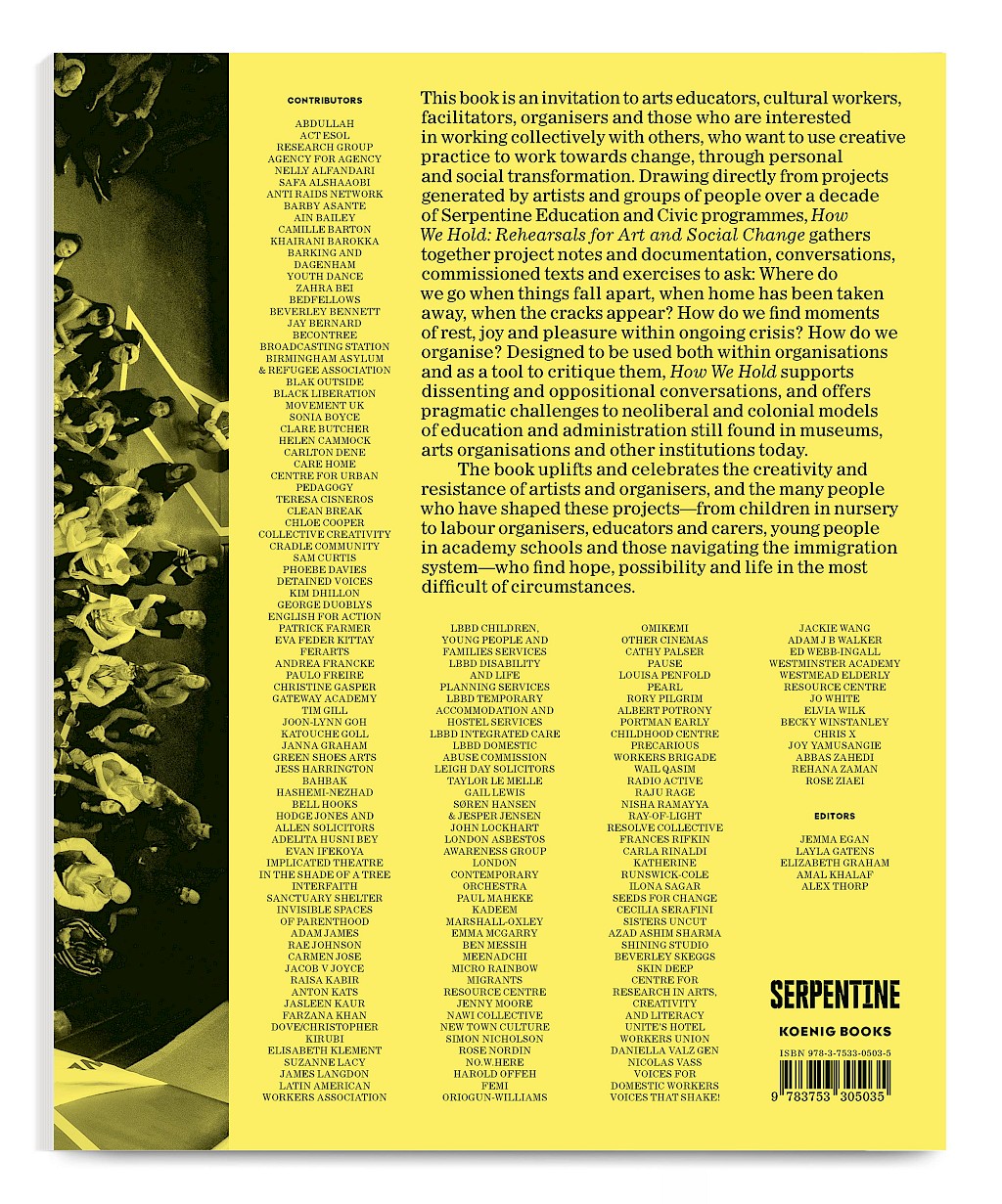 How We Hold presents more than a decade of collaborative projects organised by the Serpentine Galleries’ Education and Civic Department. The publication brings together the voices and experiences of artists, organisers, educators, and many others (including children, carers, and those navigating the immigration system) who find hope, possibility and life even in the most challenging circumstances.