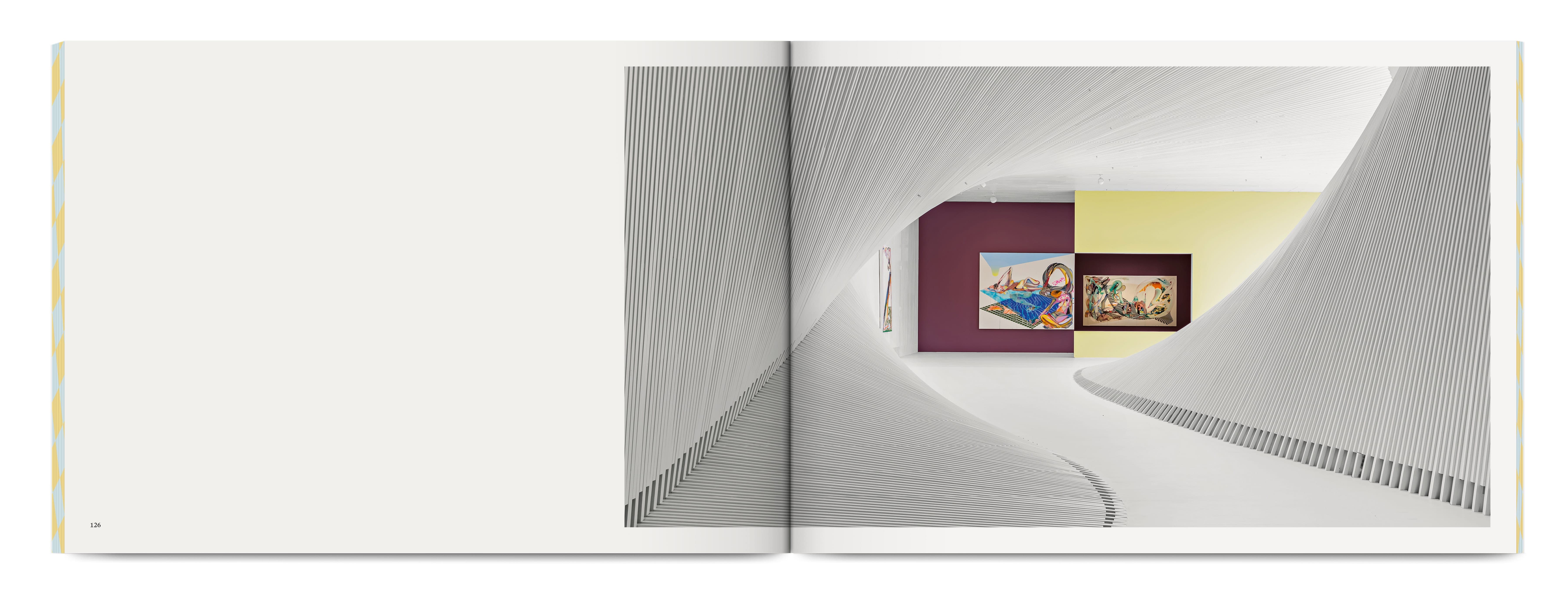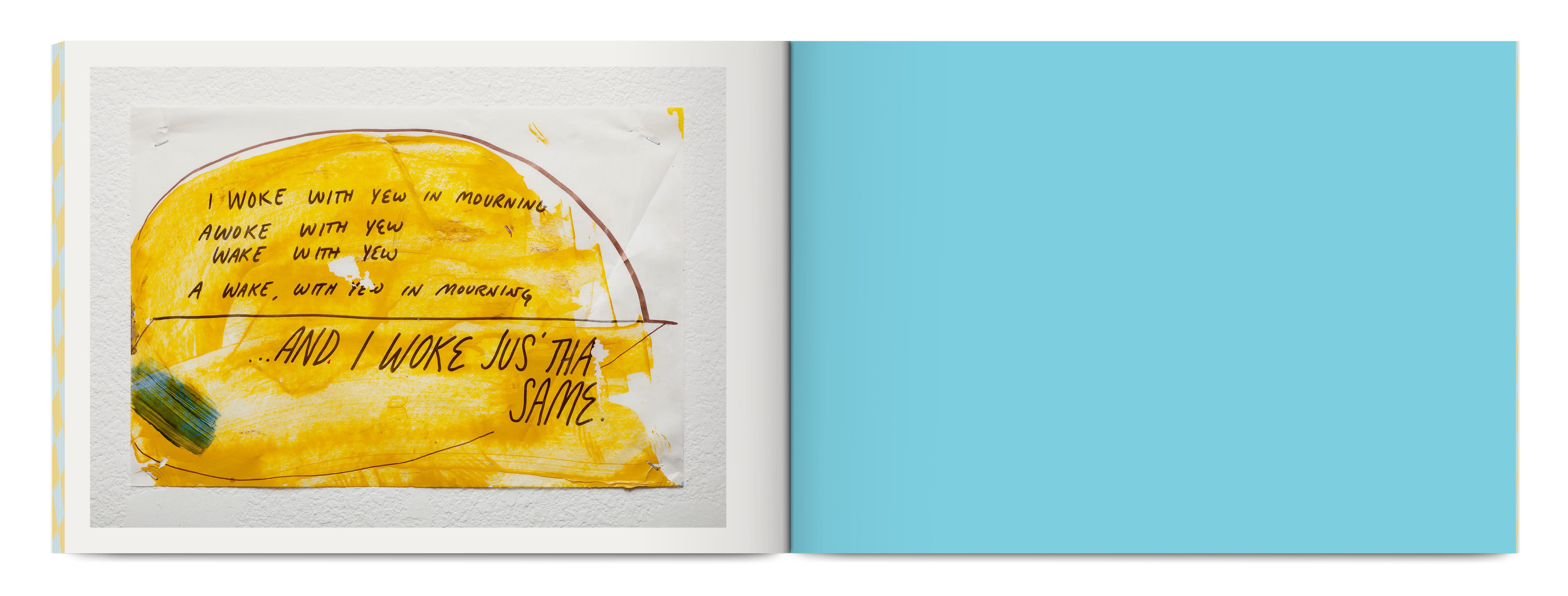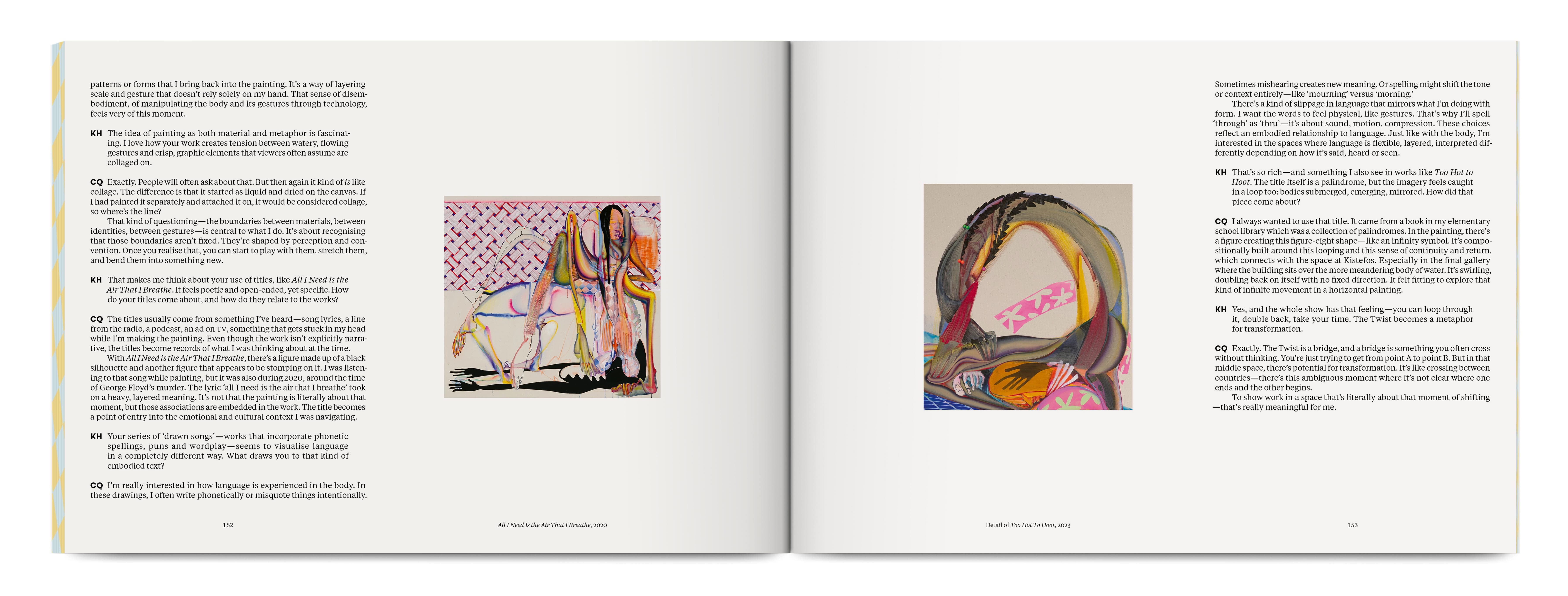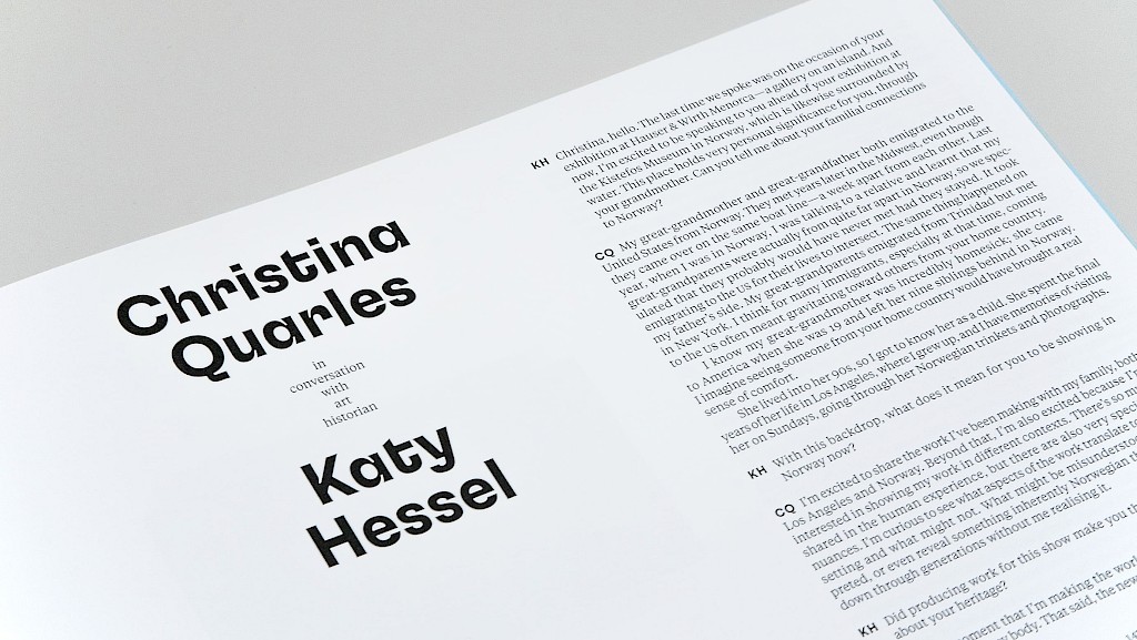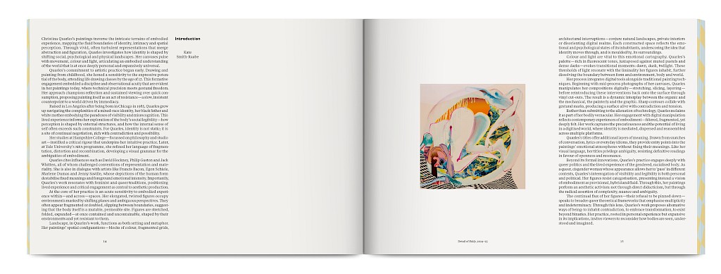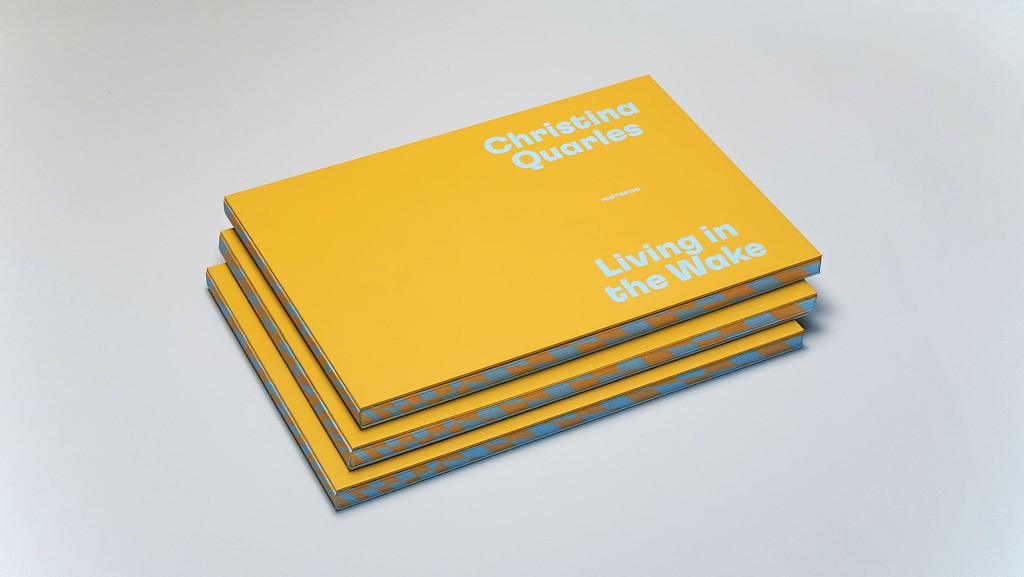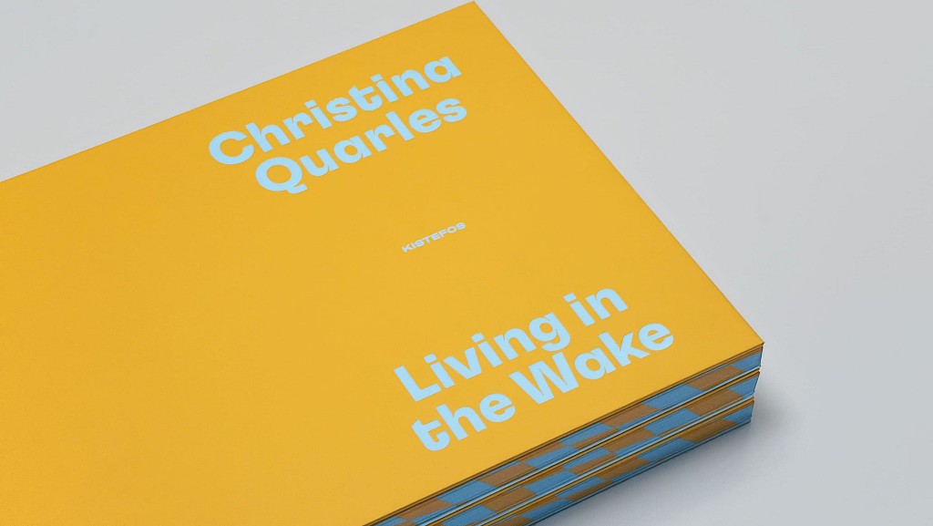 For the catalogue of Christina Quarles’ exhibition Living in the Wake at Kistefos Museum in Norway, we created an object that plays with the expectation of what a traditional book-object should look like. The four edges of the catalogue are printed with a continuous pattern taken from Christina’s recent painting Eddy, creating an ambiguity about which side holds the spine. The landscape orientation purposefully steers the viewer into an immersive experience of the often wide paintings and installation views.