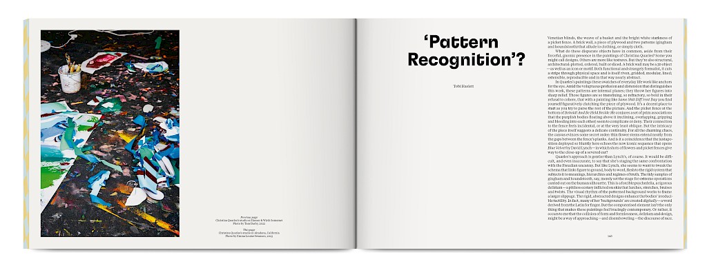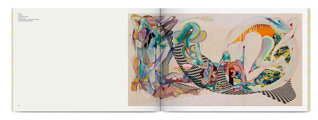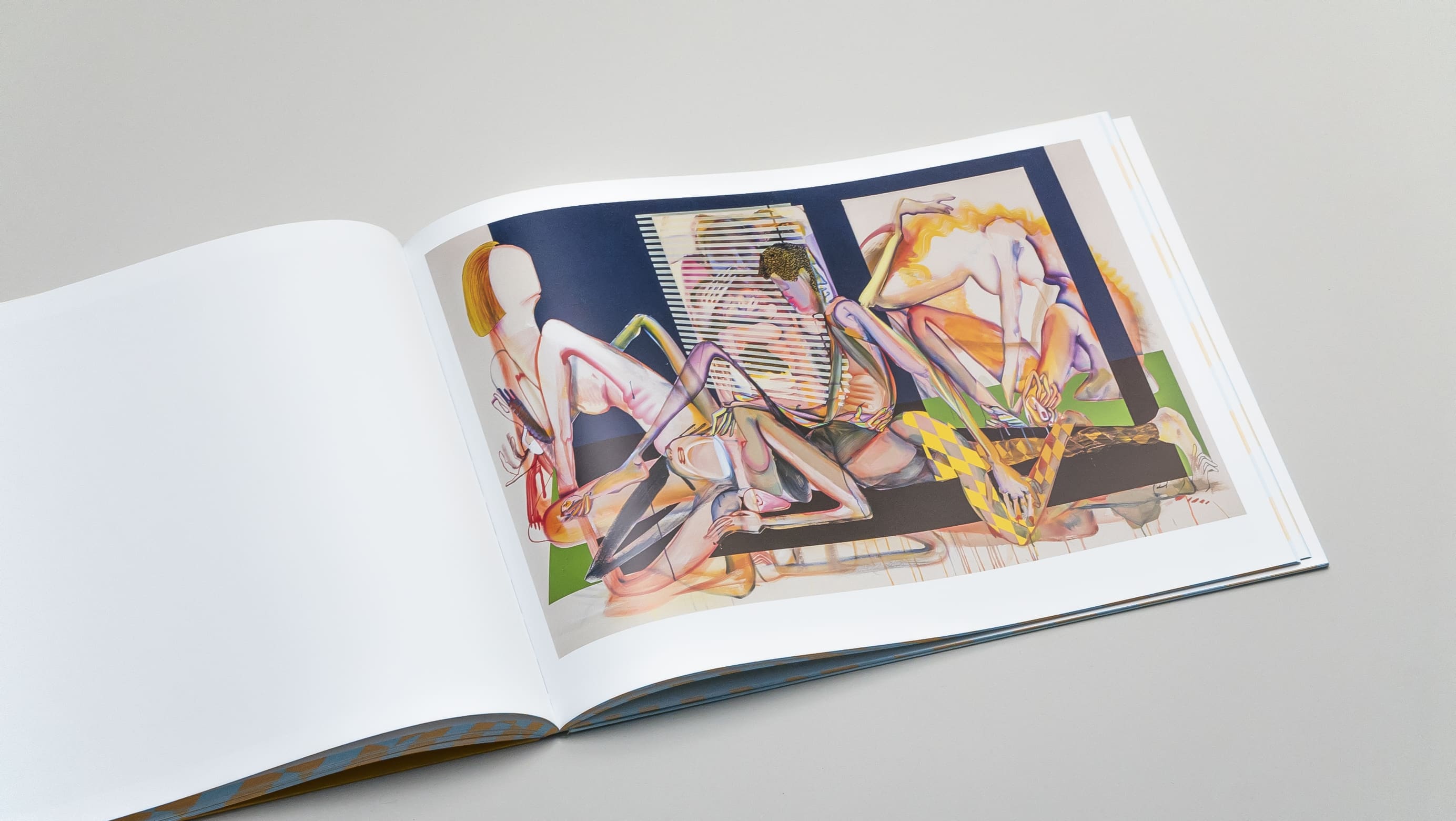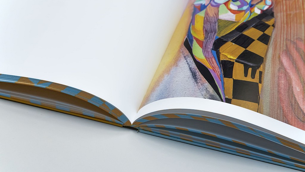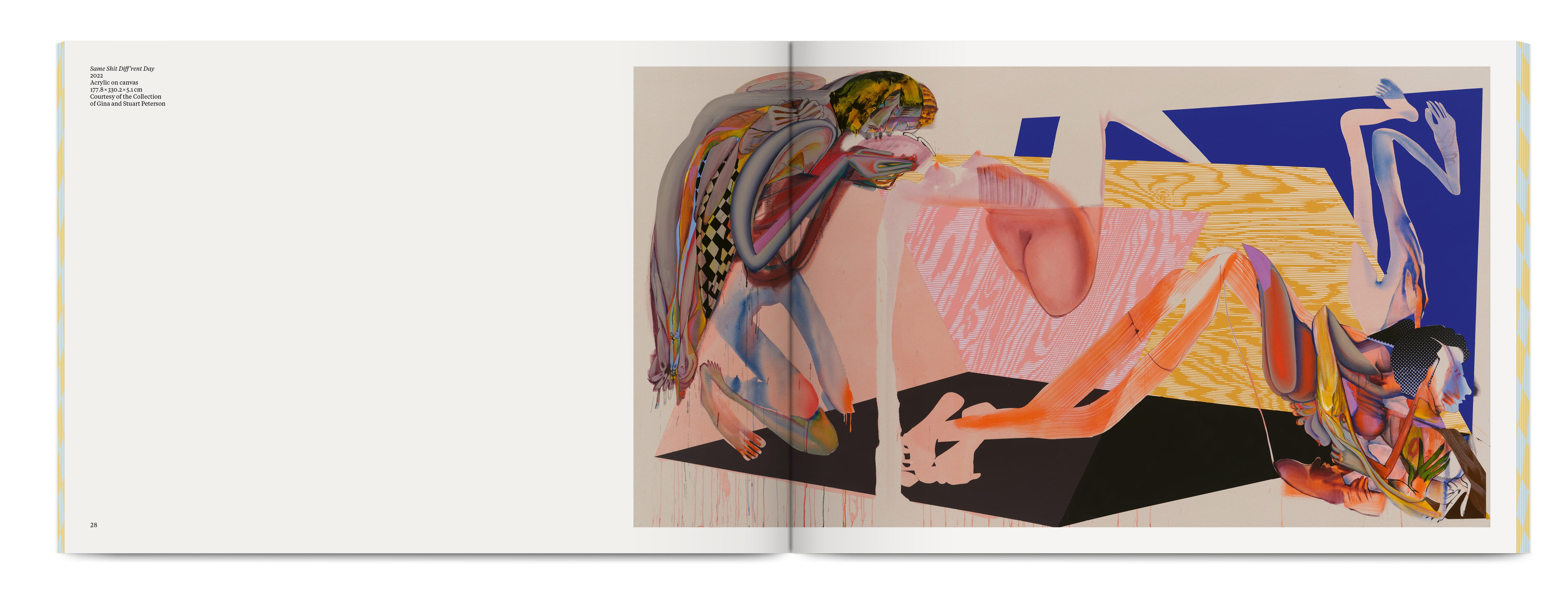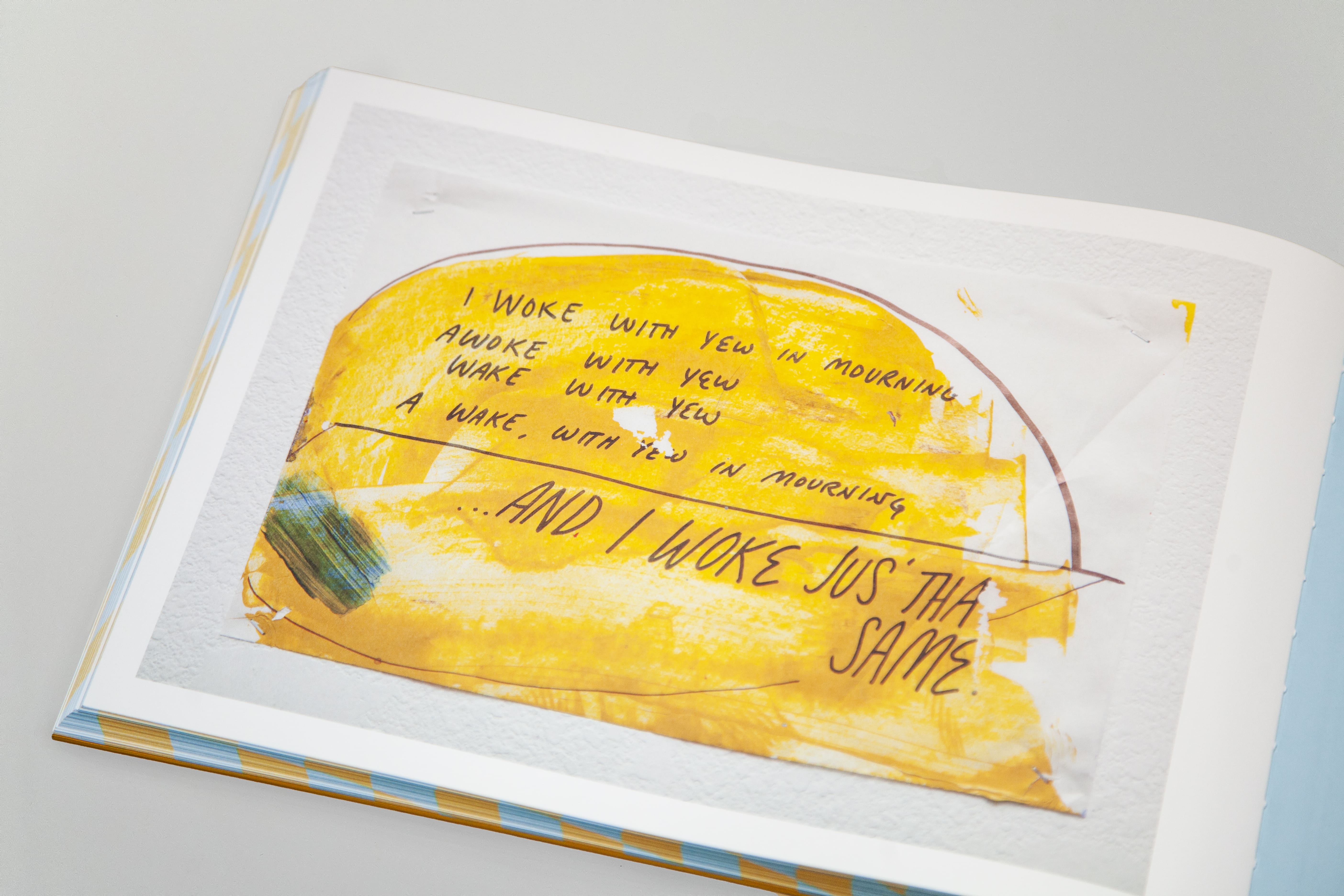 For the catalogue of Christina Quarles’ exhibition Living in the Wake at Kistefos Museum in Norway, we created an object that plays with the expectation of what a traditional book-object should look like. The four edges of the catalogue are printed with a continuous pattern taken from Christina’s recent painting Eddy, creating an ambiguity about which side holds the spine. The landscape orientation purposefully steers the viewer into an immersive experience of the often wide paintings and installation views.