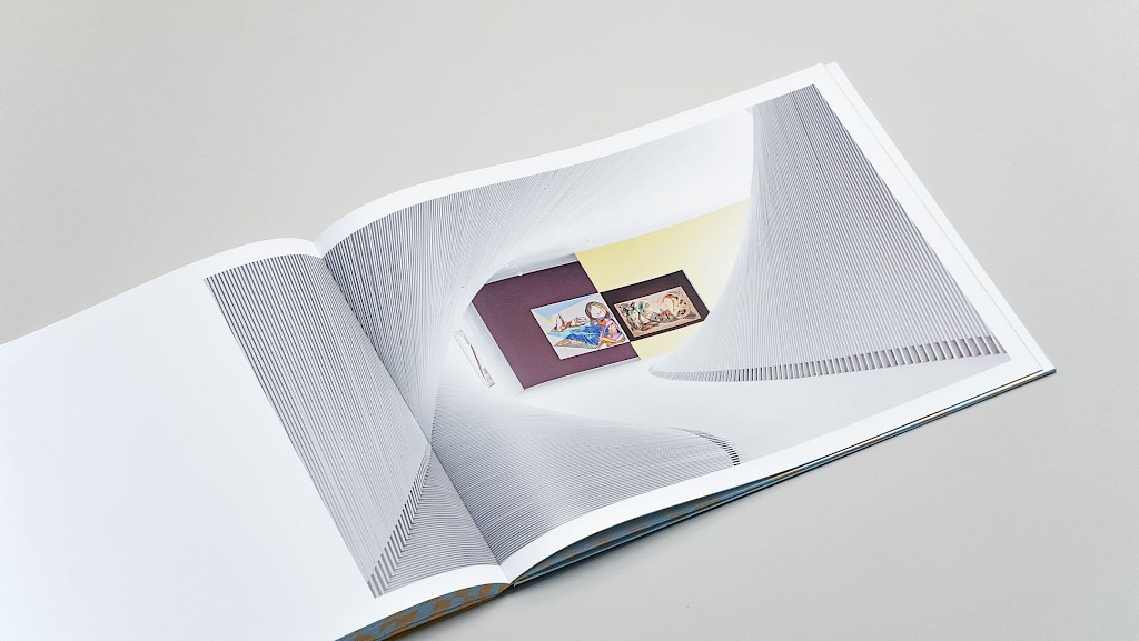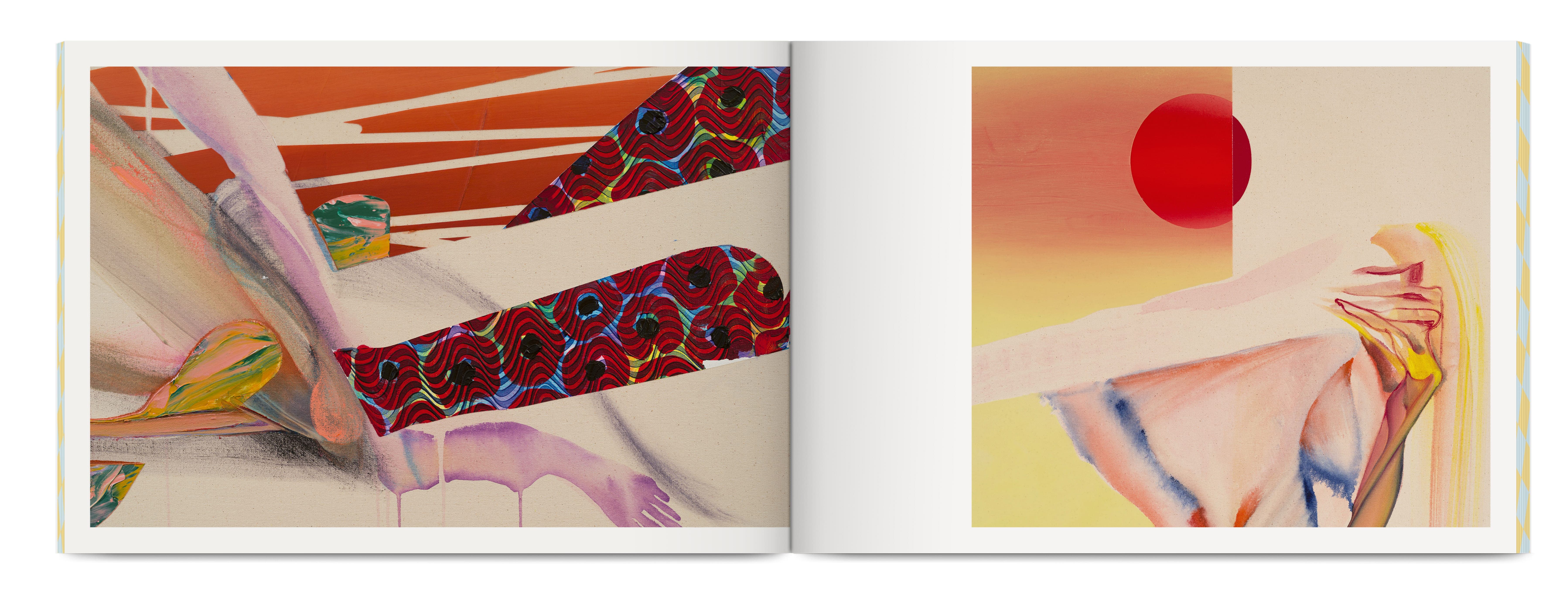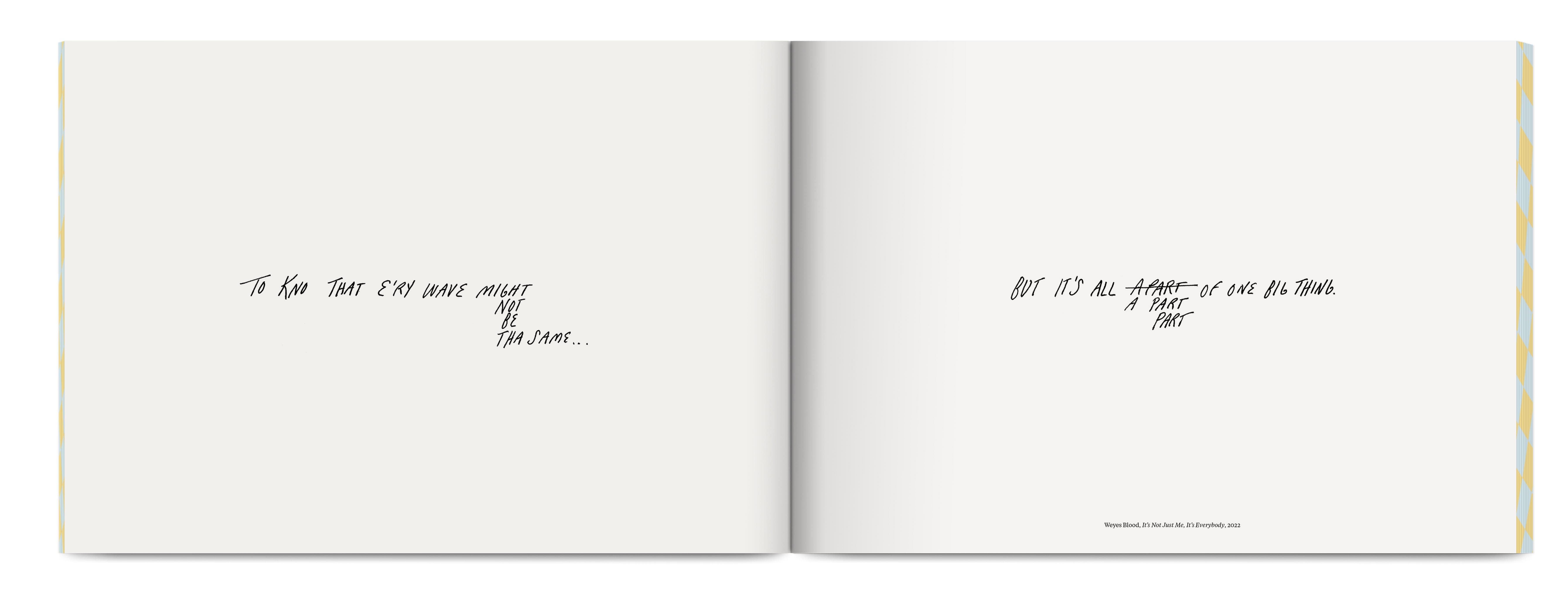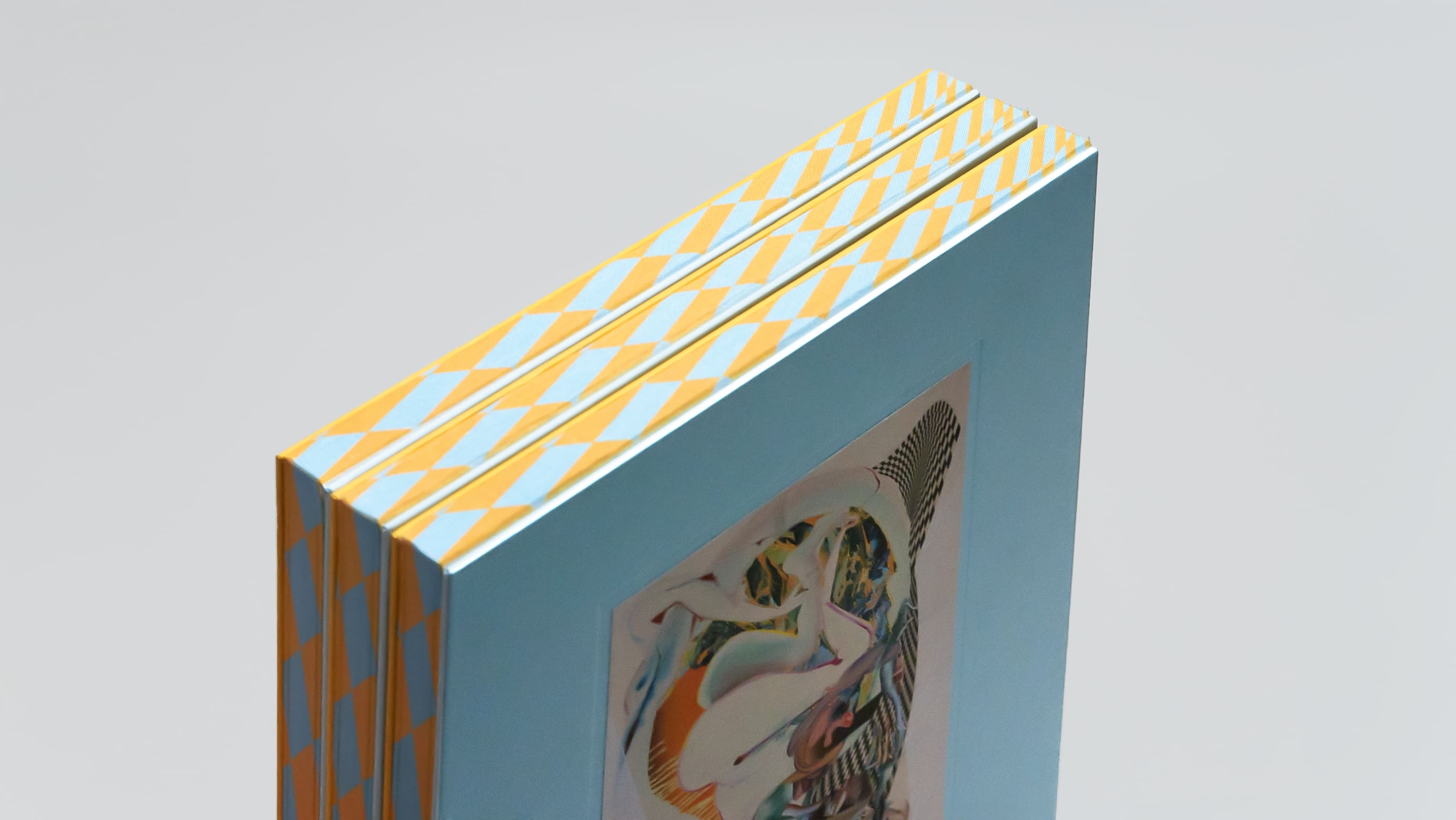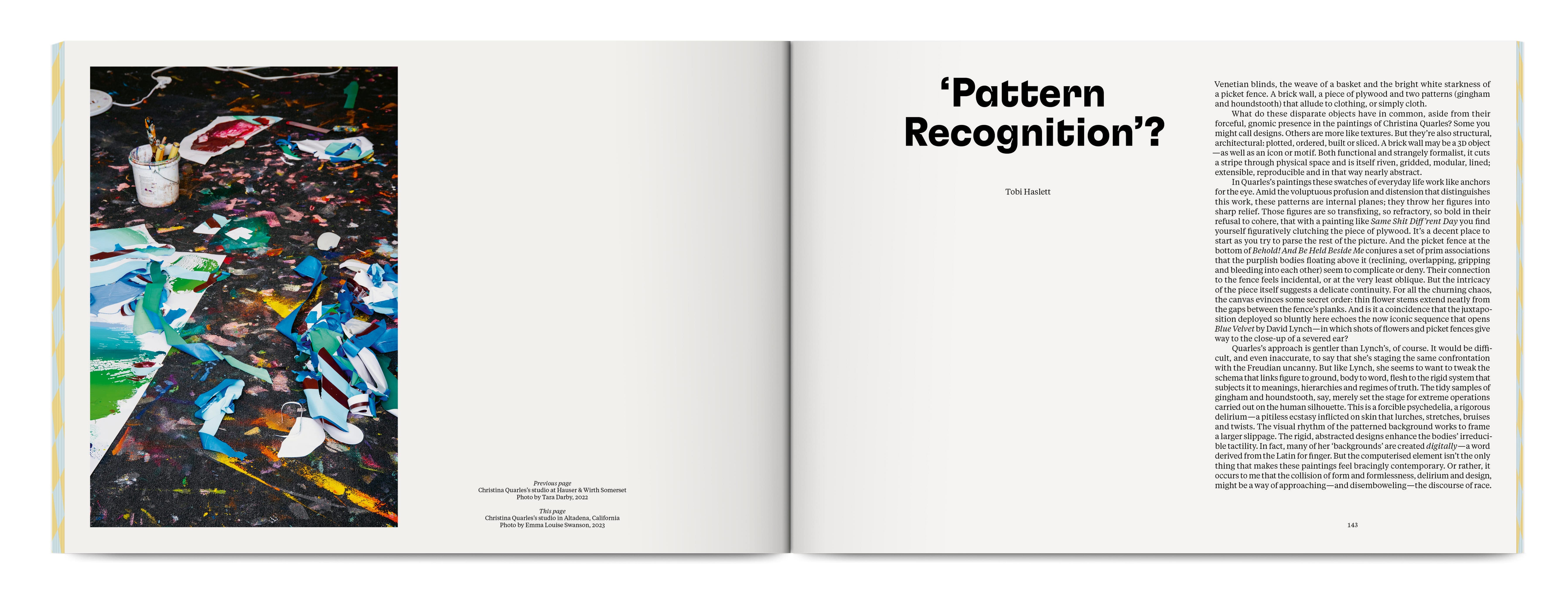 For the catalogue of Christina Quarles’ exhibition Living in the Wake at Kistefos Museum in Norway, we created an object that plays with the expectation of what a traditional book-object should look like. The four edges of the catalogue are printed with a continuous pattern taken from Christina’s recent painting Eddy, creating an ambiguity about which side holds the spine. The landscape orientation purposefully steers the viewer into an immersive experience of the often wide paintings and installation views.