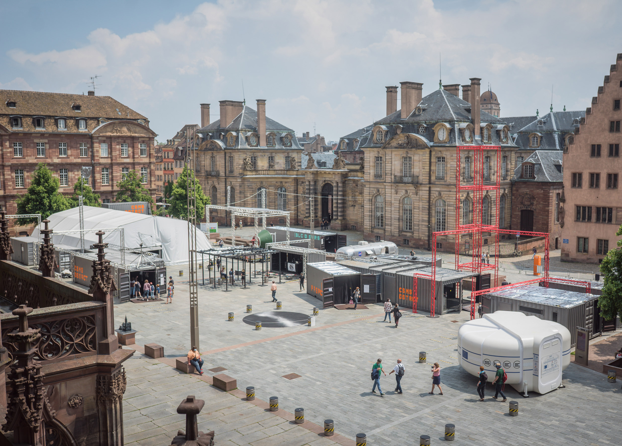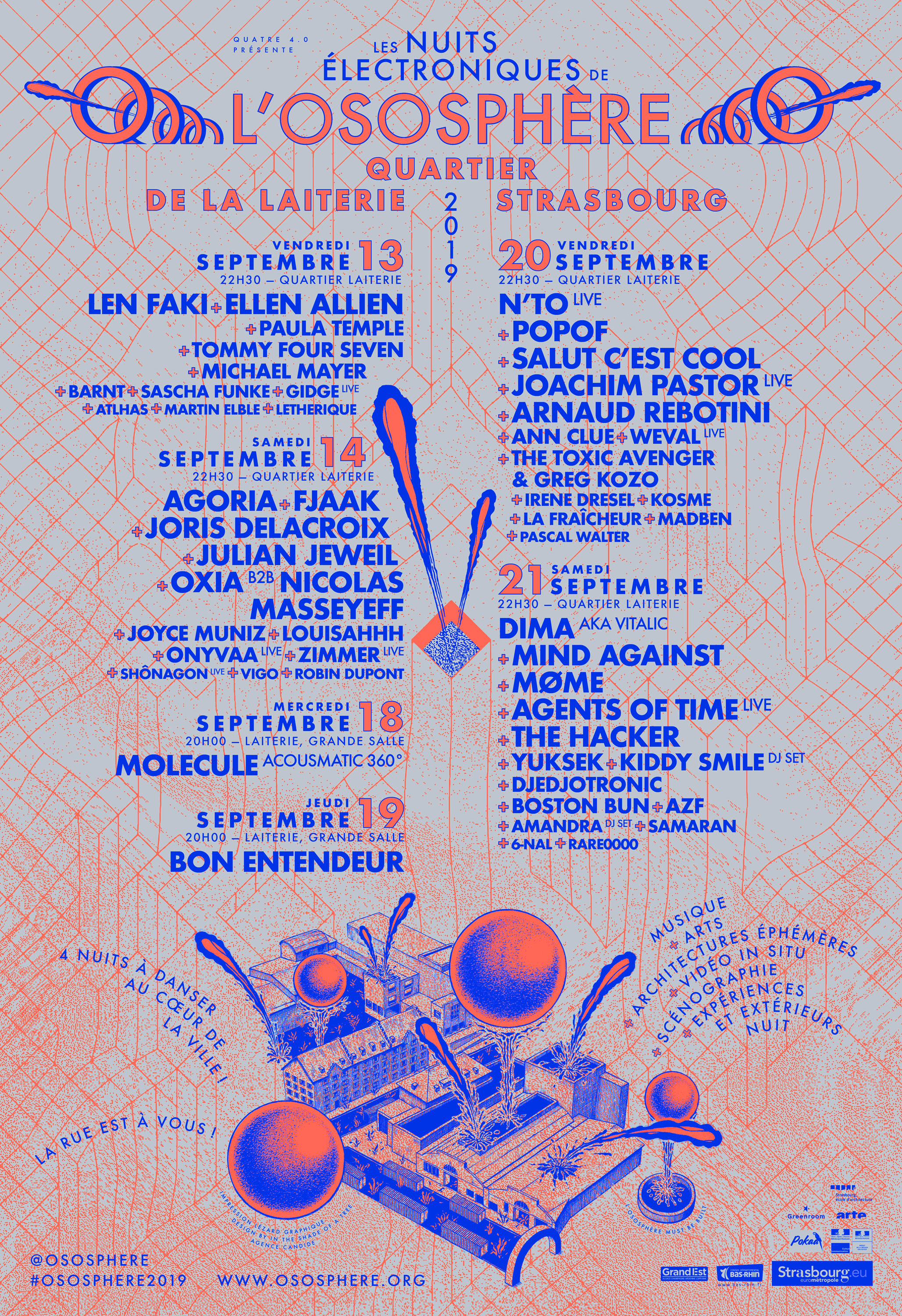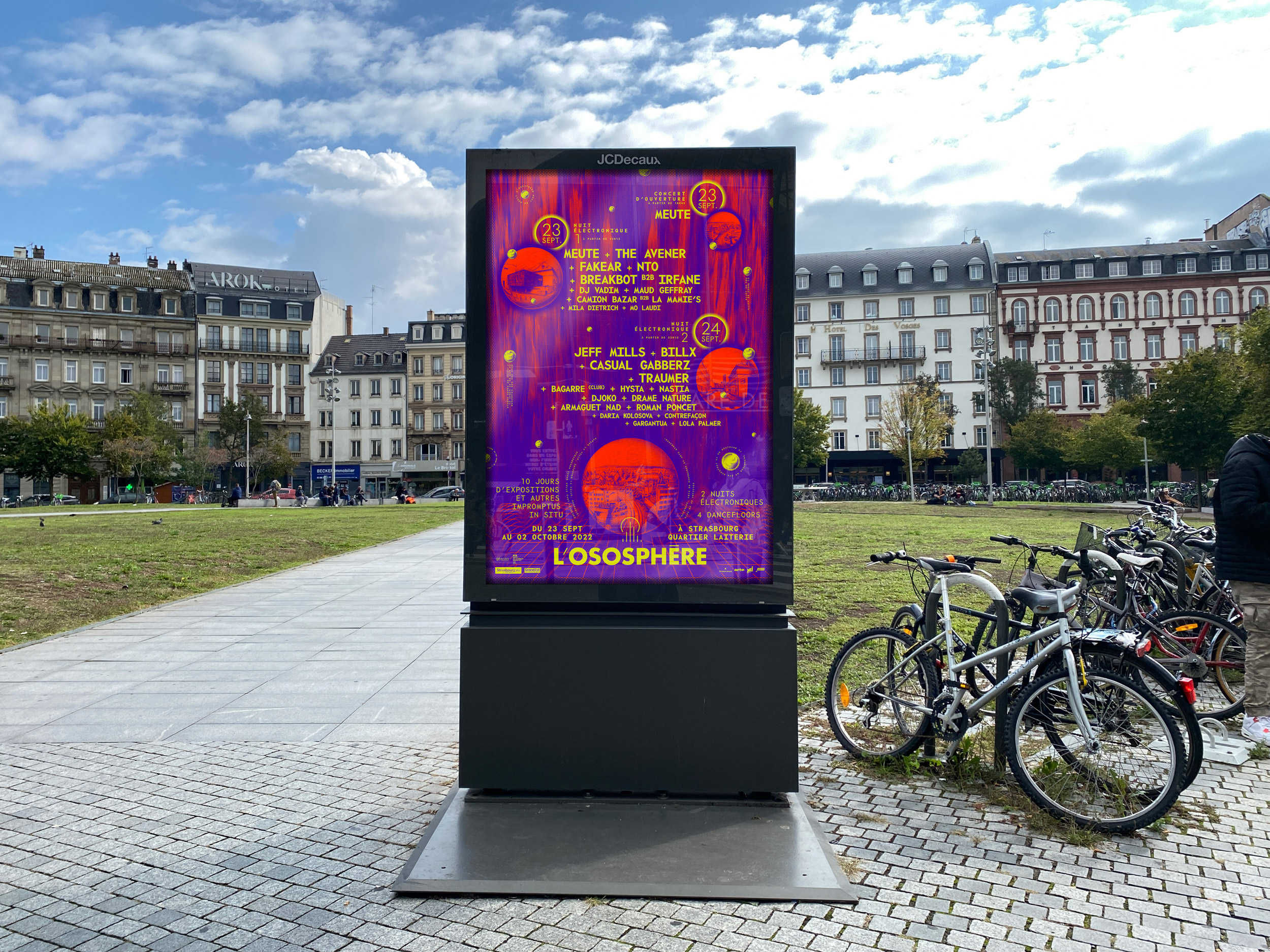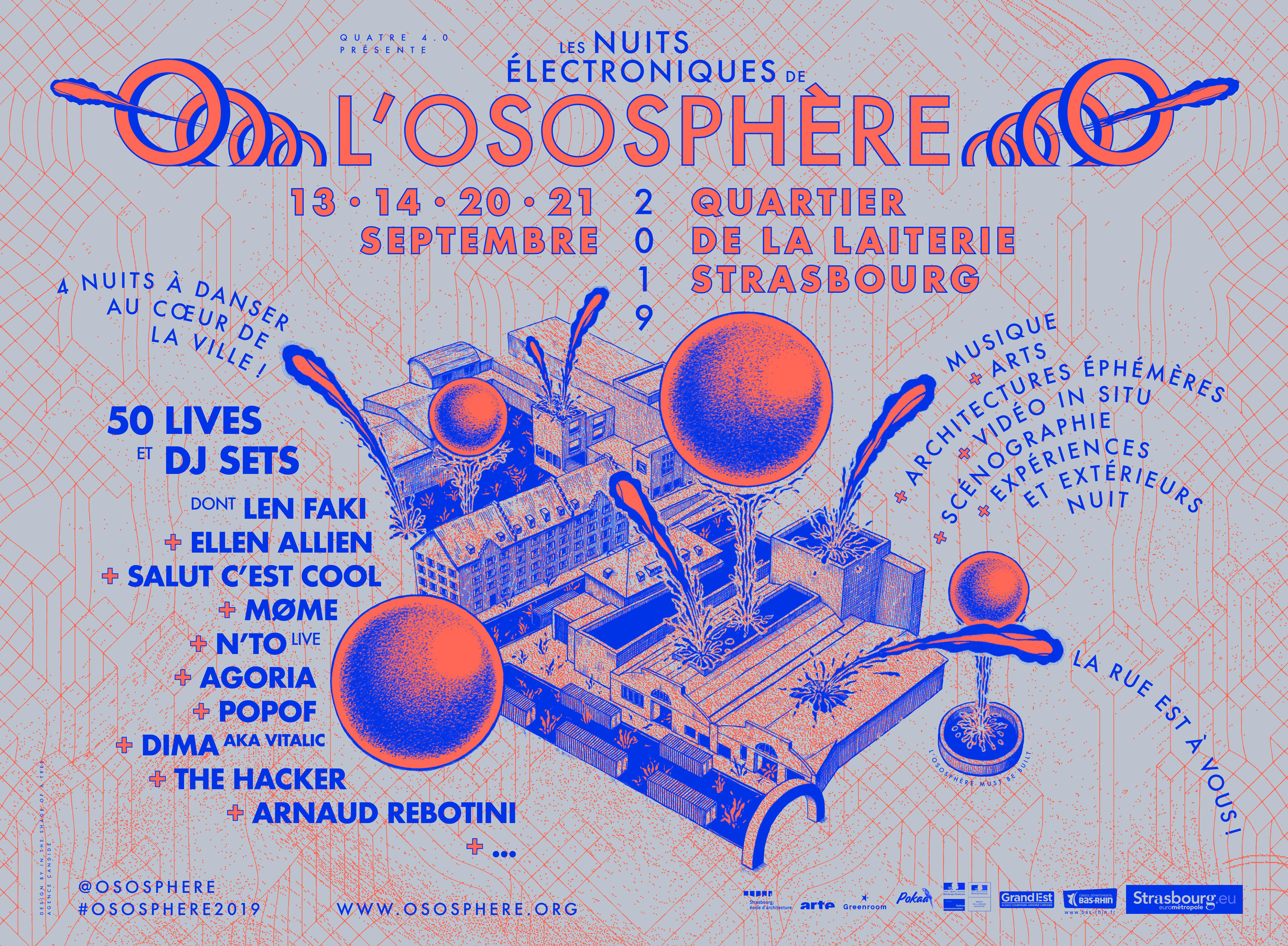 L’Ososphère is a Strasbourg-based festival bringing together electronic music and digital art for thirty years. We have been art directing the festival’s identity since 2010. This long lasting relationship has led to the production of numerous drawings of the various locations where the festival has taken place. We see this gesture both as a recording of a mutating city and its urban landscape, and as a manifestation of its multiple activations by the artists, the visitors, the residents.