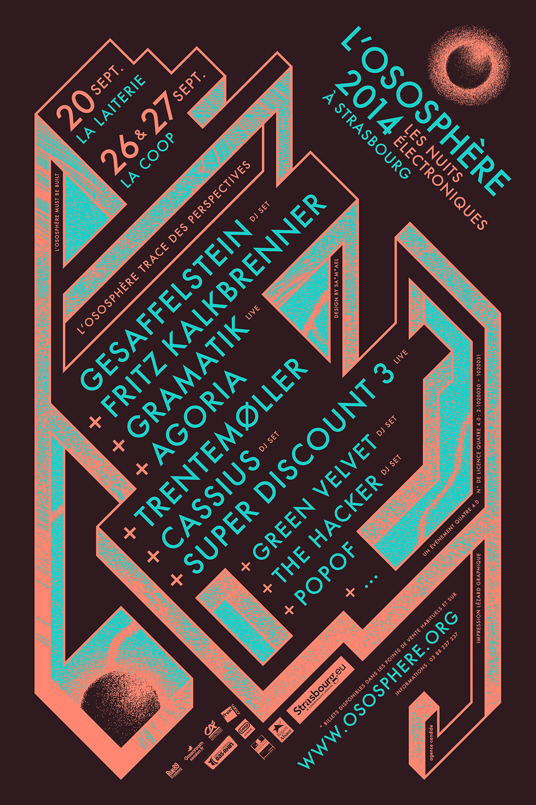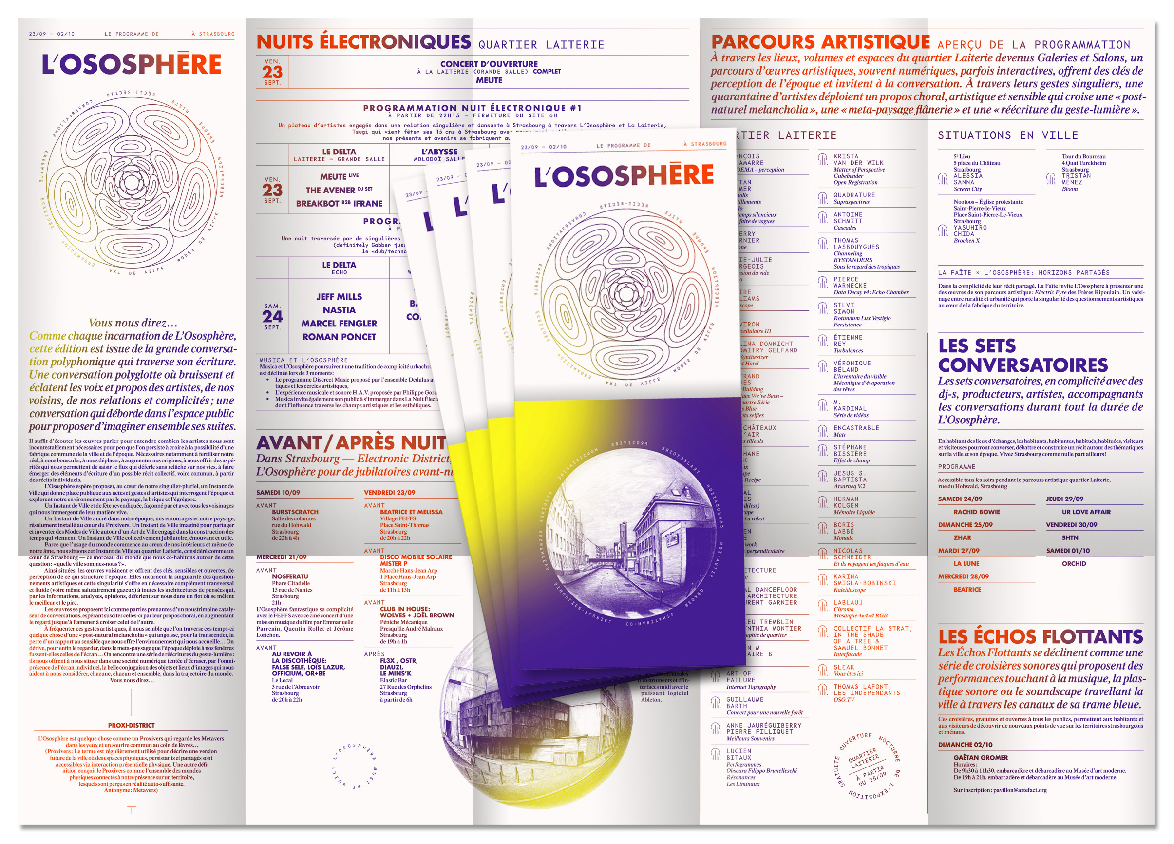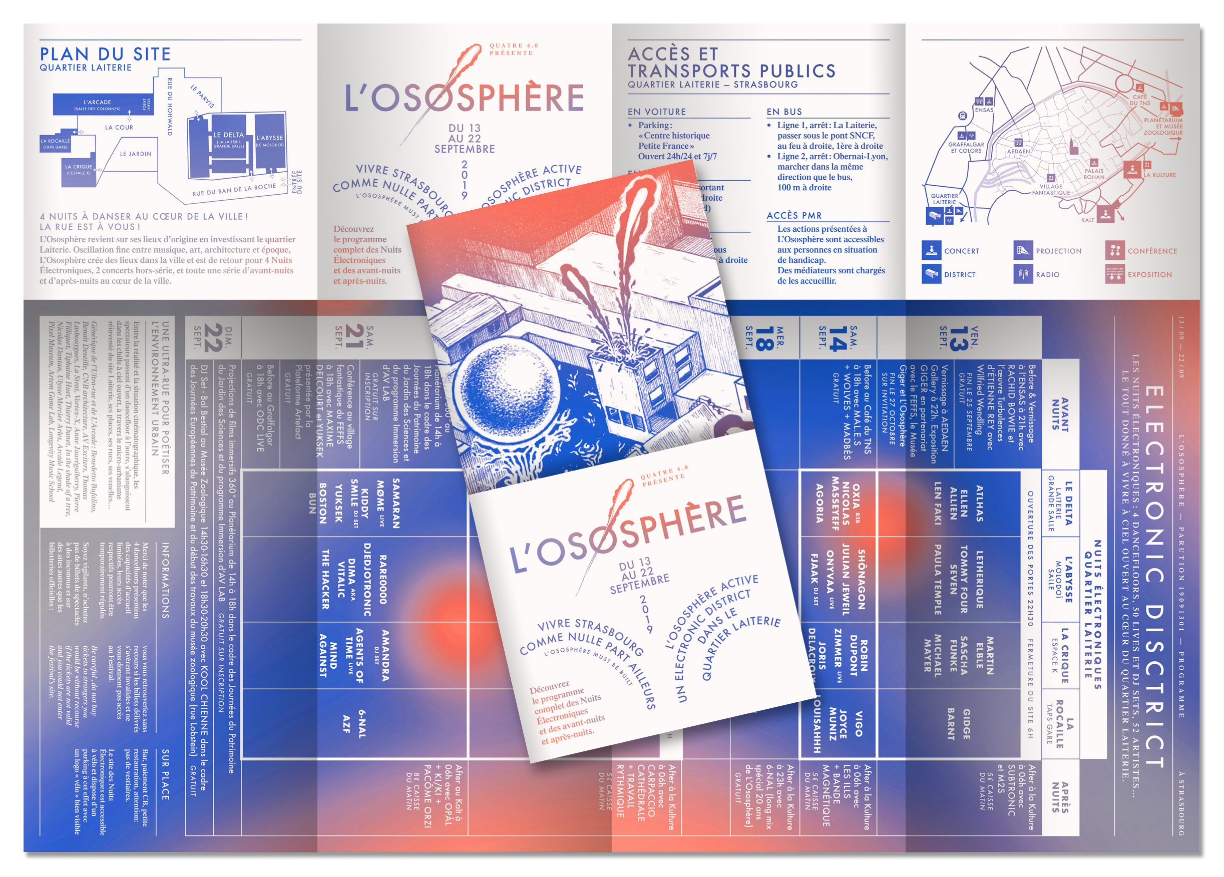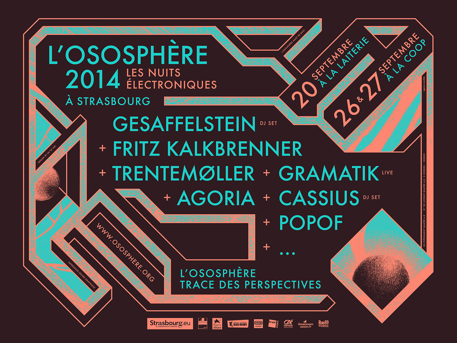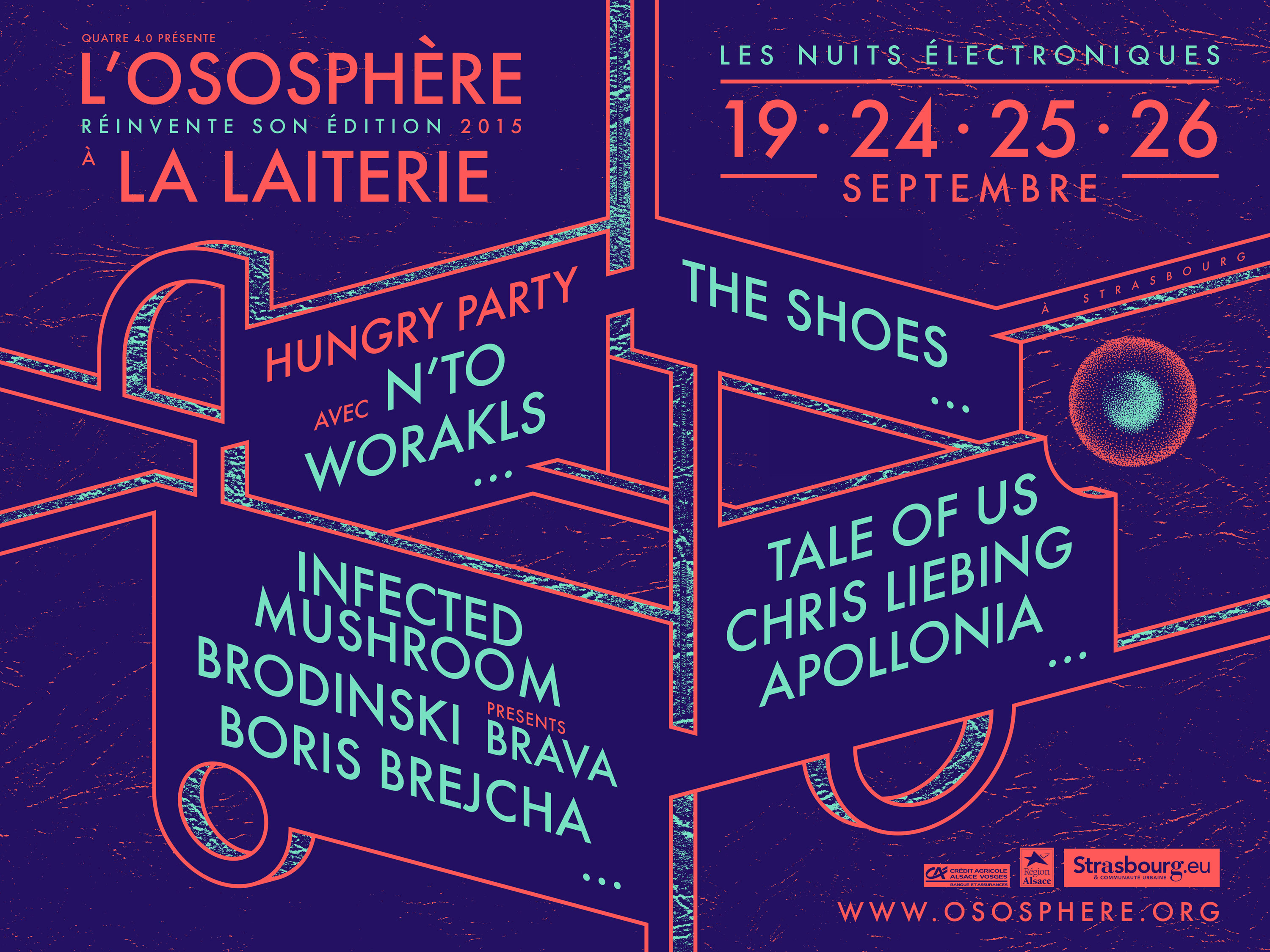 L’Ososphère is a Strasbourg-based festival bringing together electronic music and digital art for thirty years. We have been art directing the festival’s identity since 2010. This long lasting relationship has led to the production of numerous drawings of the various locations where the festival has taken place. We see this gesture both as a recording of a mutating city and its urban landscape, and as a manifestation of its multiple activations by the artists, the visitors, the residents.
