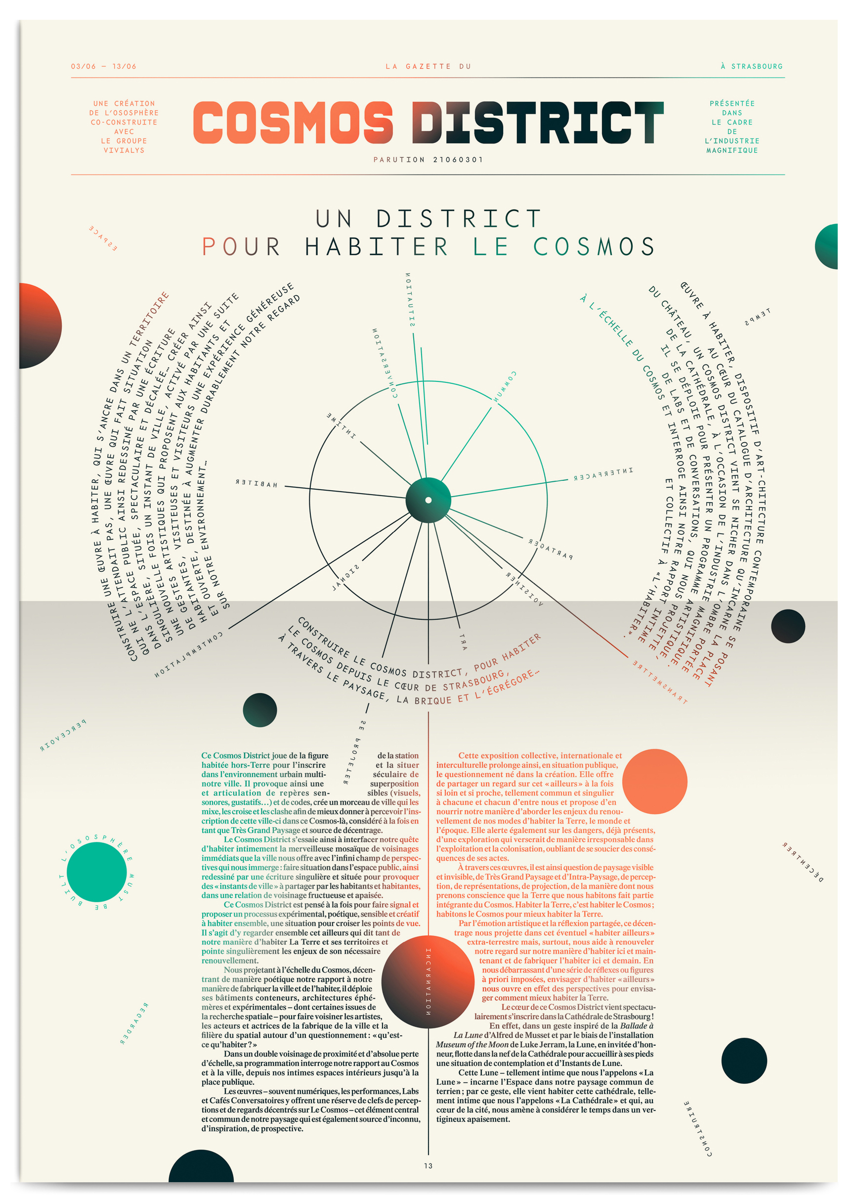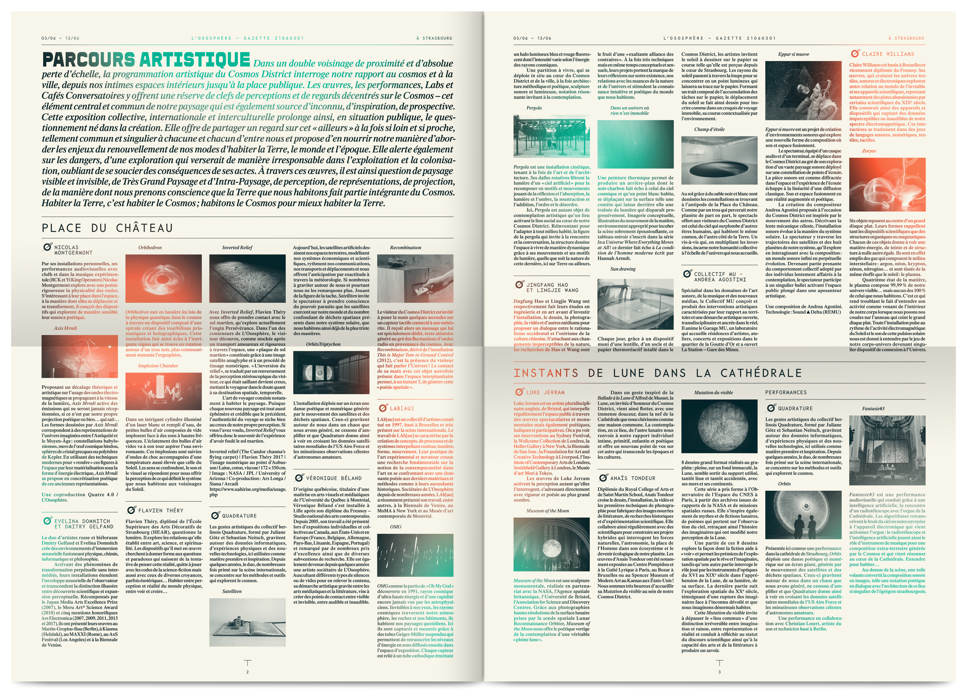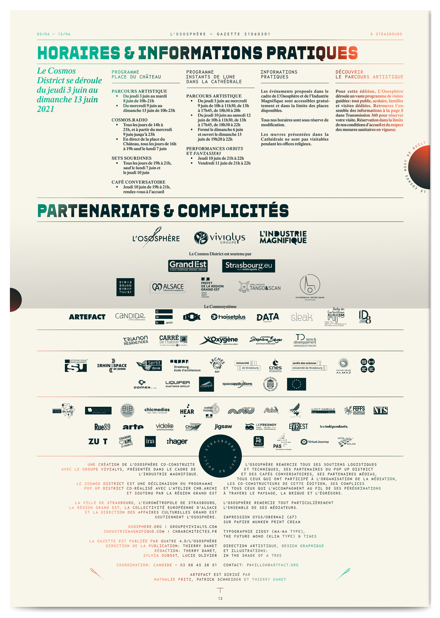 “You will tell us… Like every incarnation of L’Ososphère, this edition is the result of the great polyphonic conversation that runs through its writing. A multilingual conversation in which the voices and words of artists, of our neighbors, of our relationships, and of our collaborations buzz and burst forth; a conversation that spills over into the public space, inviting us to imagine its future together. One need only listen to the works speaking to hear how much we undeniably need artists, as long as we continue to believe in the possibility of a shared construction of the city and the time we live in. They are necessary, in particular, to fertilize our reality, to shake us up, to move us, to expand our origins, to offer us fragilities that allow us to grasp the flow that relentlessly sweeps over our lives, to bring out elements of writing for a possible collective, or even common, narrative based on individual stories.” (Thierry Danet, director, on L’Osopshère 2022)