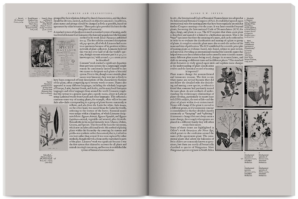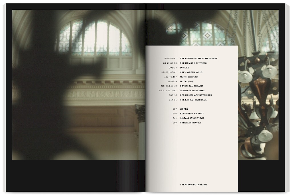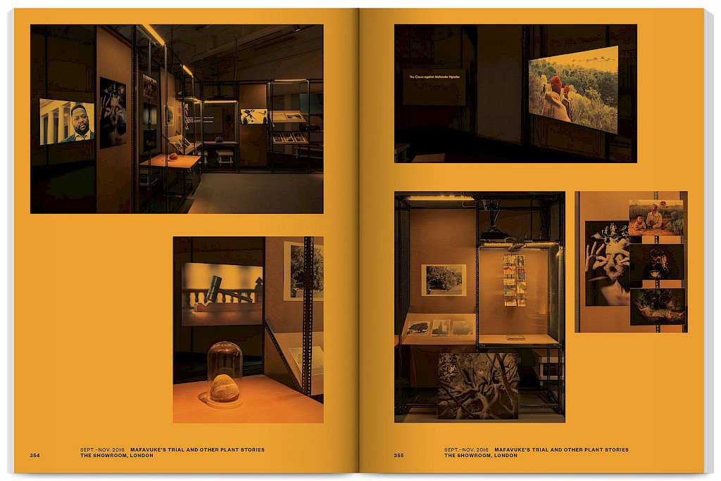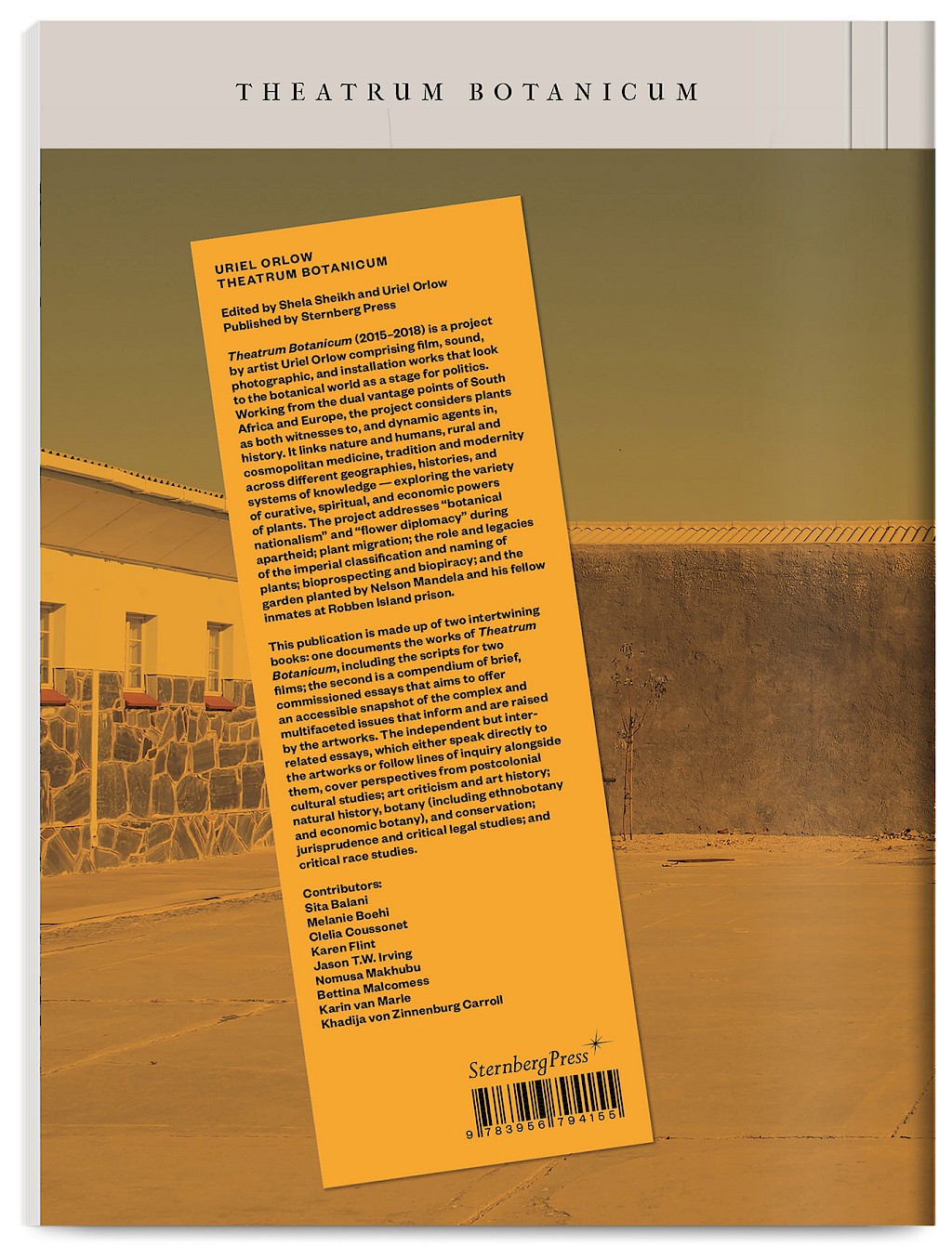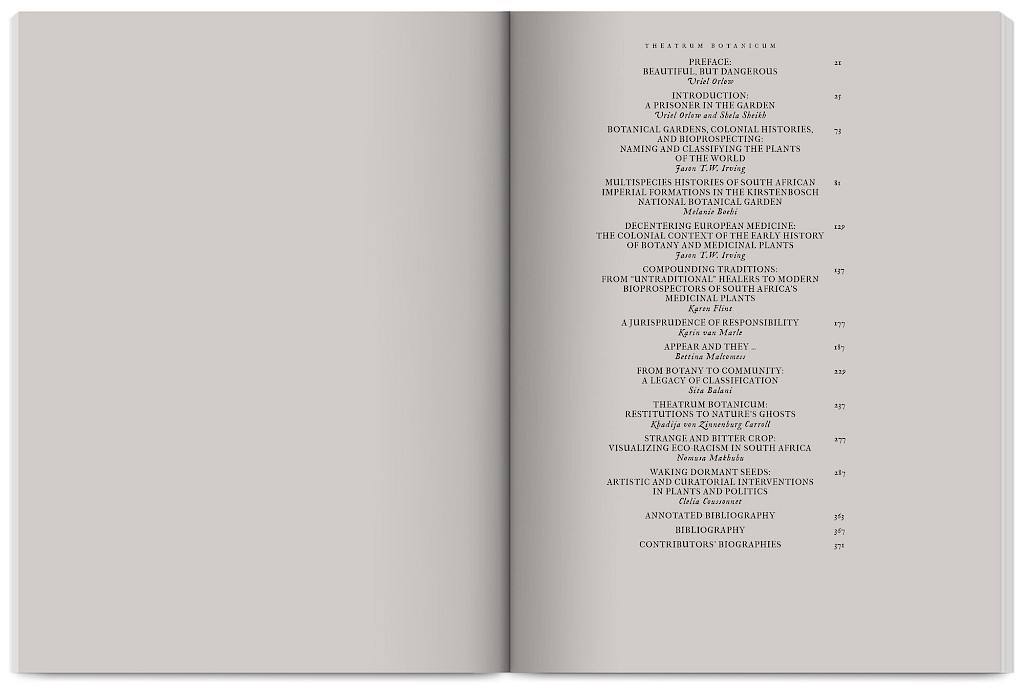 The publication comprises two intertwined books, each printed on its own paper and exploring parallel lines of inquiry. One documents the artworks (including film scripts); the other offers essays covering postcolonial studies, art history, botany, critical law and race studies, providing context for the complex issues they raise. The layout and typefaces draw from 16th- and 17th-century botanical manuals and codices.