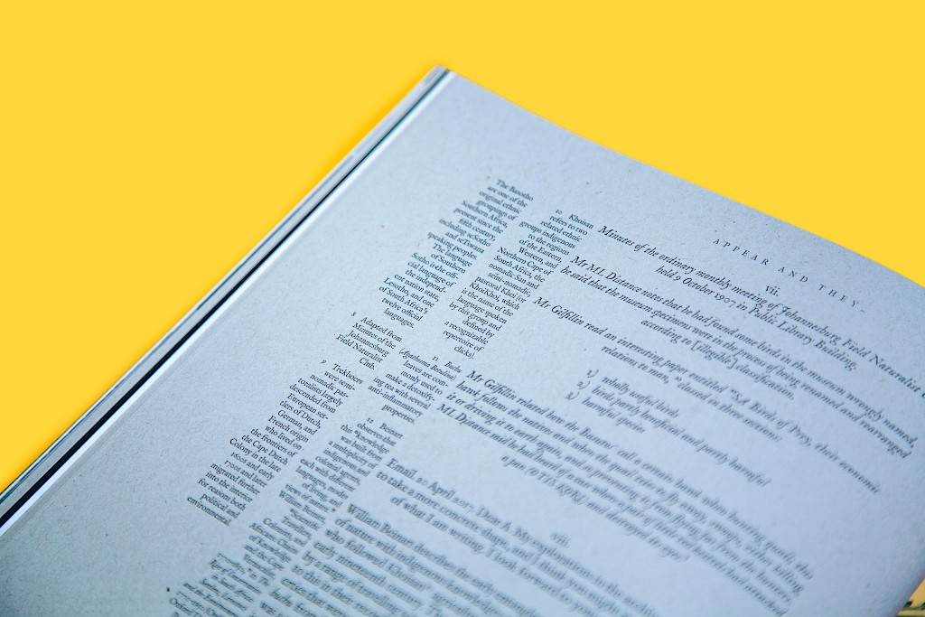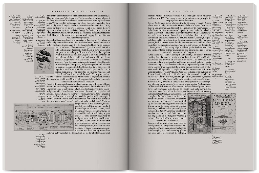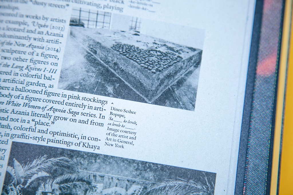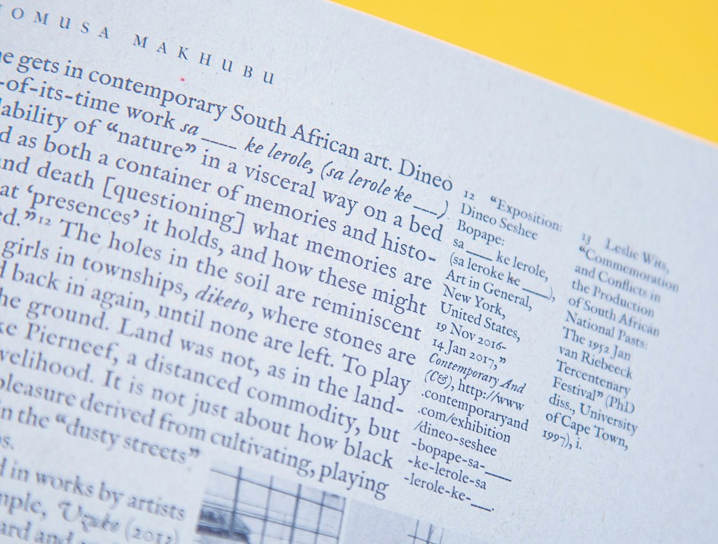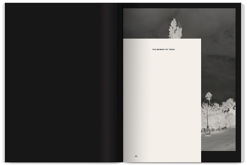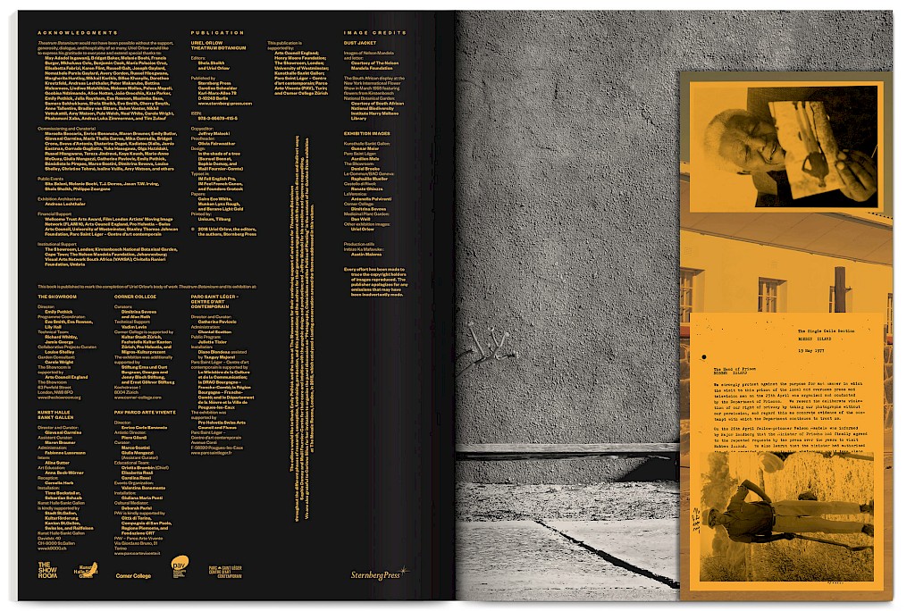 The publication comprises two intertwined books, each printed on its own paper and exploring parallel lines of inquiry. One documents the artworks (including film scripts); the other offers essays covering postcolonial studies, art history, botany, critical law and race studies, providing context for the complex issues they raise. The layout and typefaces draw from 16th- and 17th-century botanical manuals and codices.